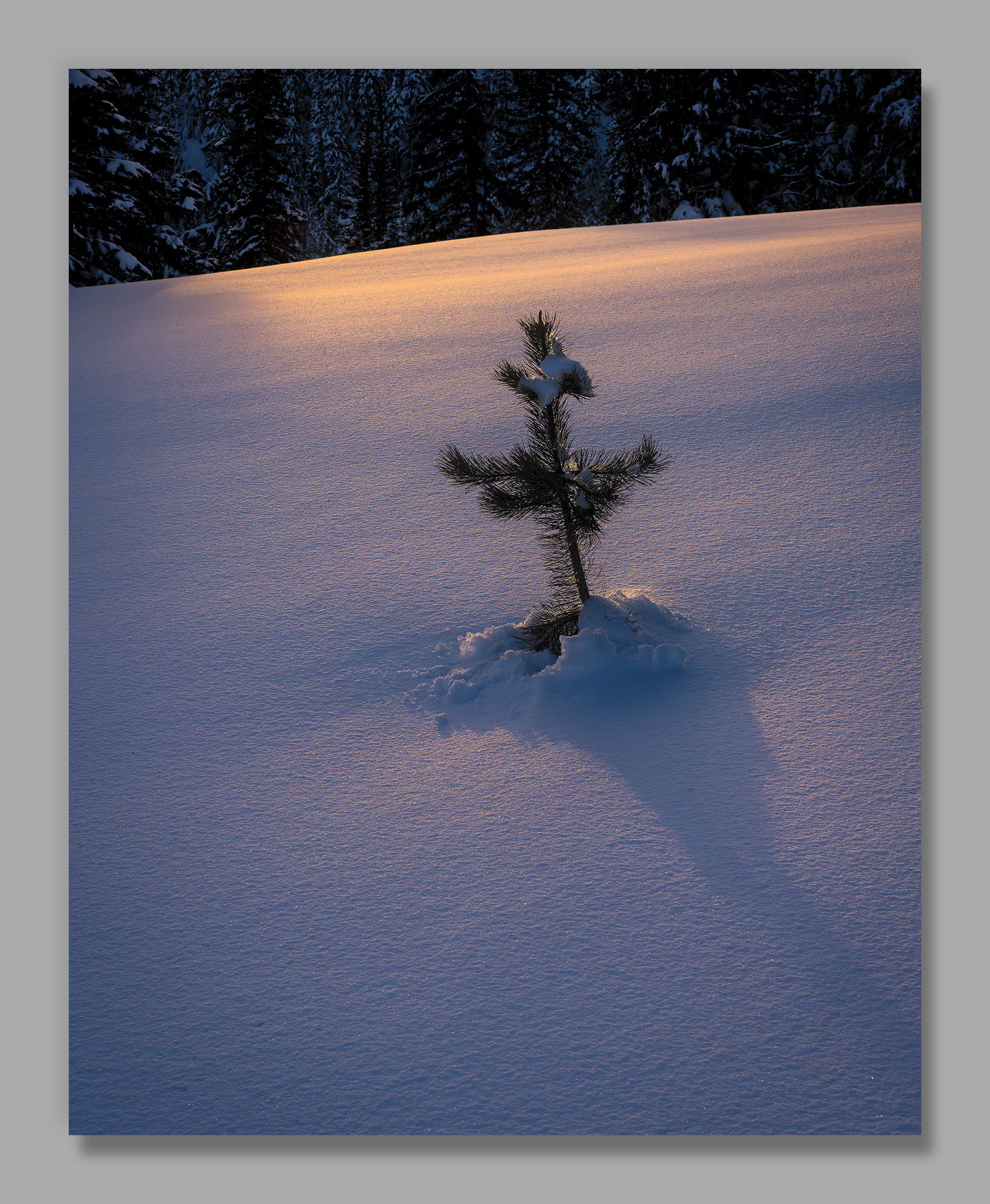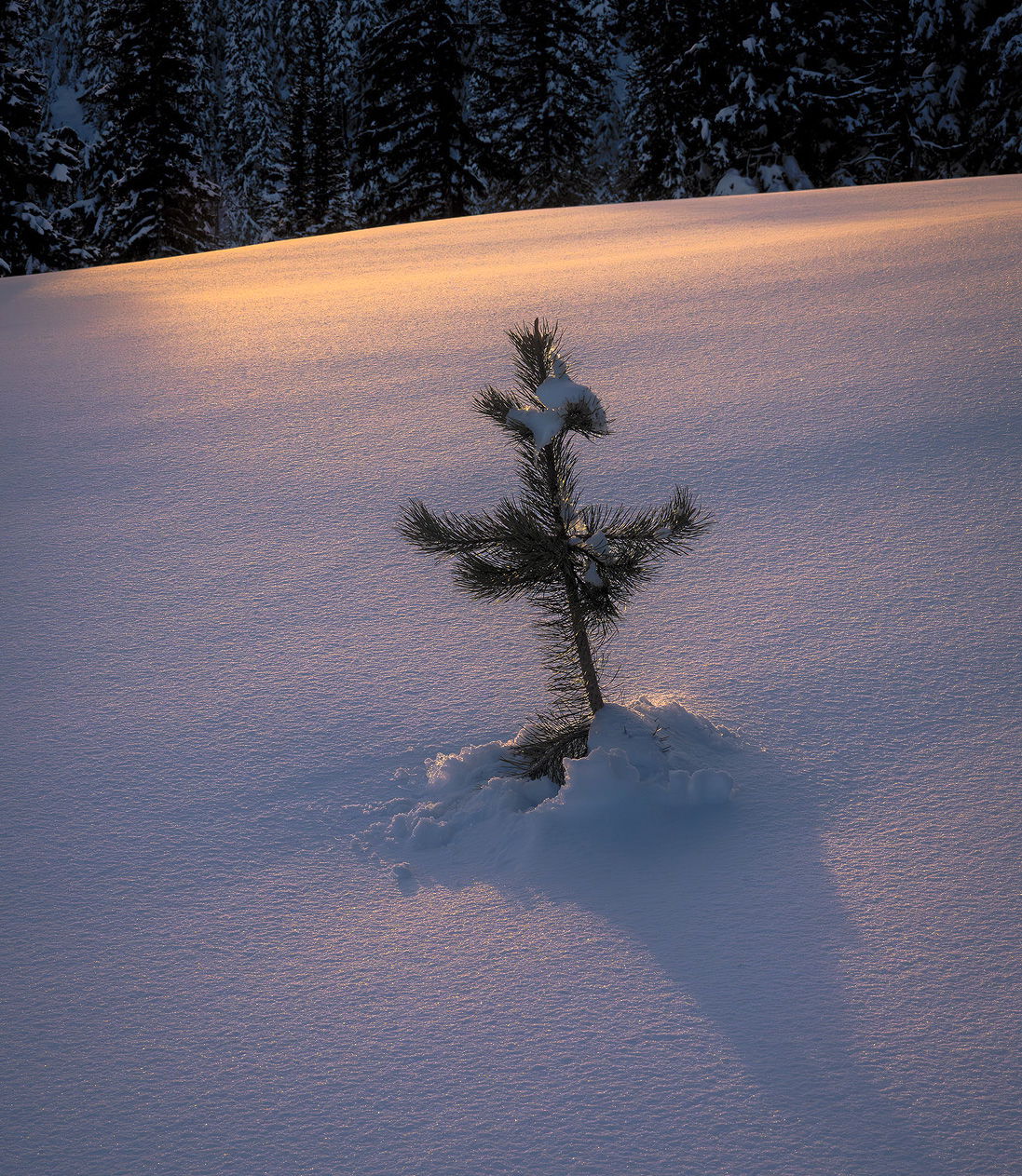 This is quite simply a fantastic image. I love the colors, the cool foreground and the lovely sky color reflecting off the snow. I like the shadow too, and I think not having all of the shadow is fine. It reminds us the tree is growing. I also don’t have any issue with the background tree line. It’s there, it makes sense, it’s not important, and it doesn’t draw the eyes. It reminds us this little specimen is part of a larger community, but right now, it’s the star of this show.