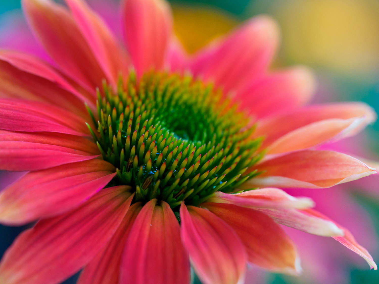 I like how you chose to focus on the closest edge of the flower and then it fades to the colorful rainbow of colors. Unusual composition that works well to showcase the echinacea.
