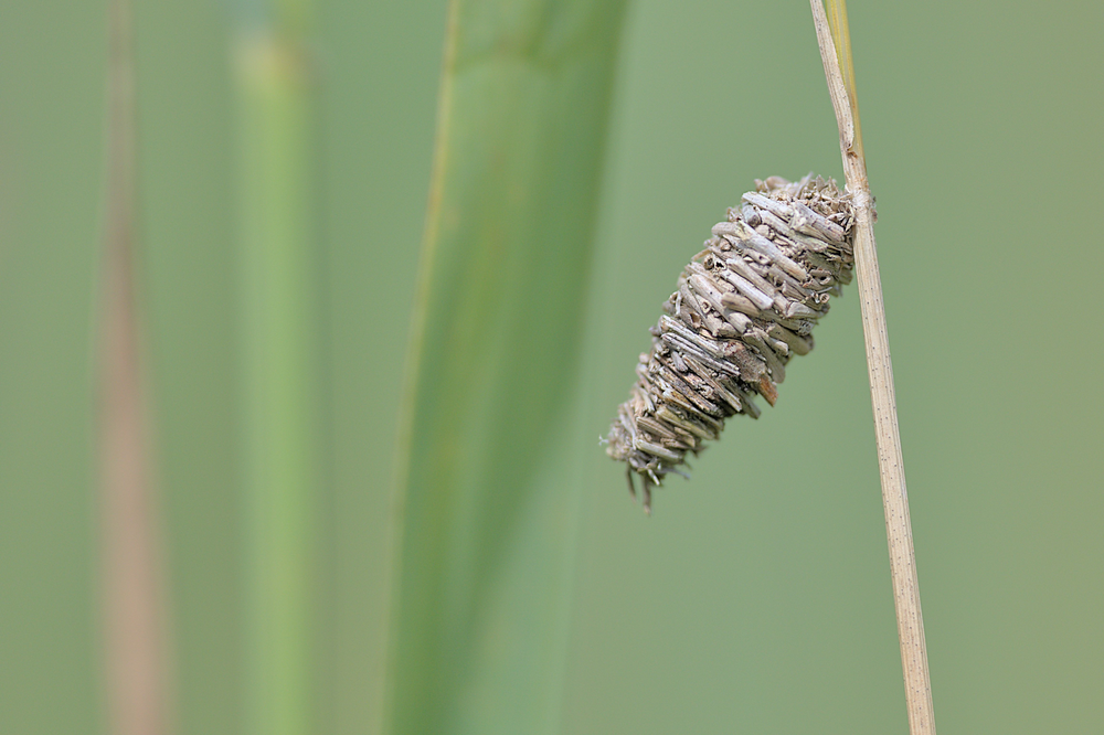 The light brown bagworm moth (Megalophanes viciella), a species of butterfly, travels with a bag. The caterpillars build the bag from dead plant matter, which they spin together with a silk thread in a characteristic pattern.