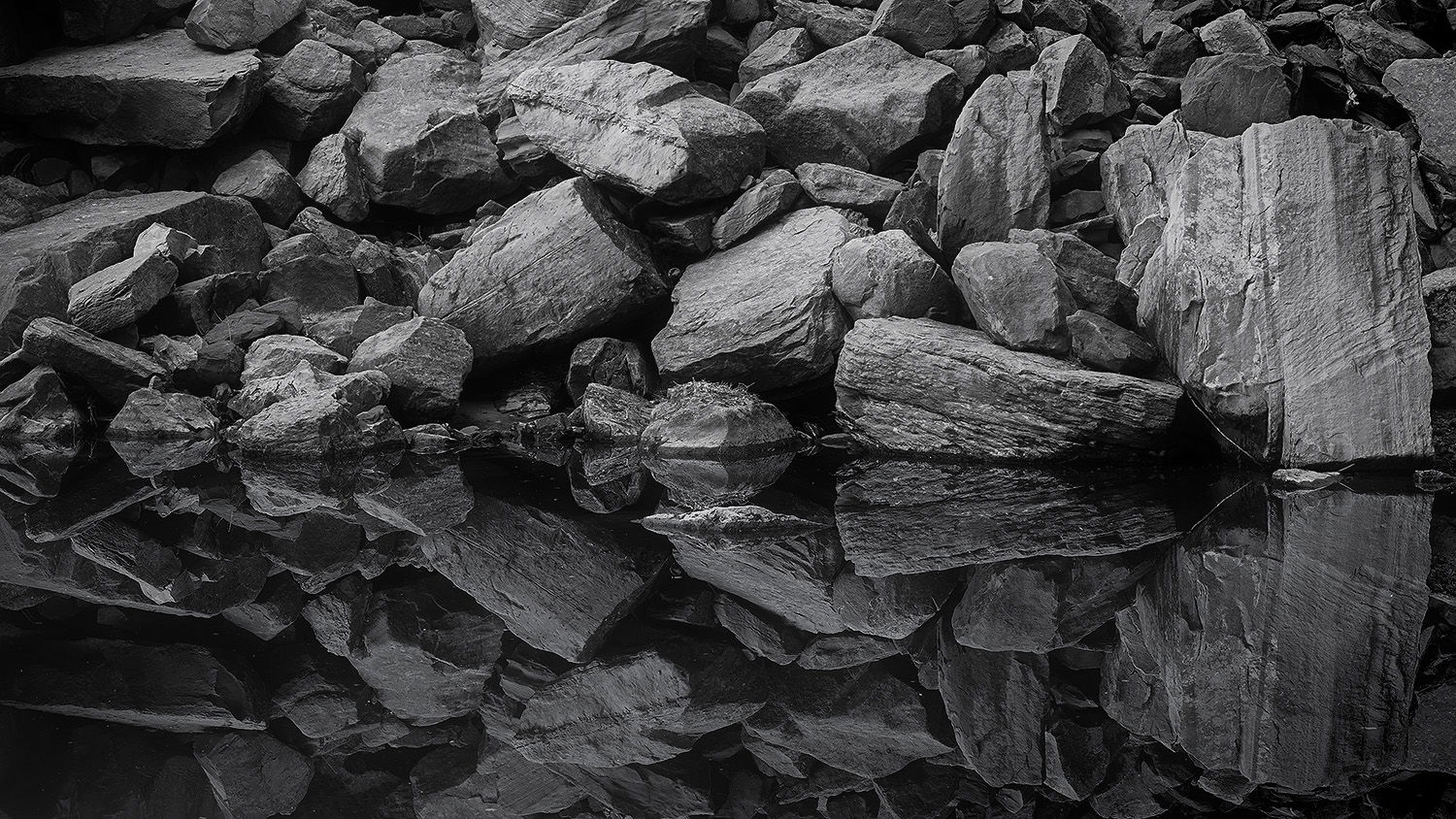 I was curious what a couple of tweaks to the black and white would look like (sharpening the reflection a little more than the rocks themselves, adding a bit of a vignette to the right side, dropping the brightest areas a bit to try and get a touch more detail, etc.). Not sure if any of it adds, but here’s what I came up with:
