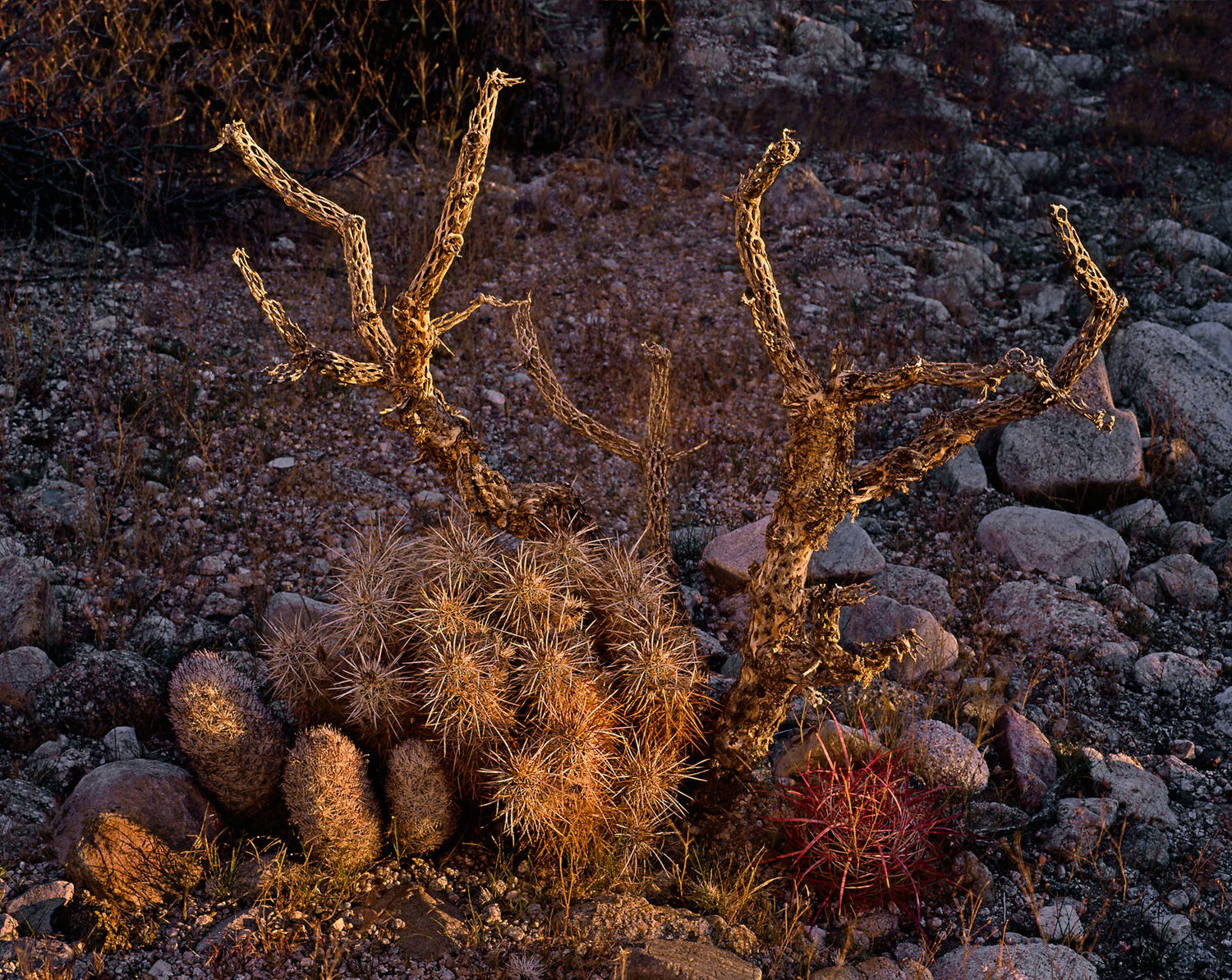 Paul, your look of this cacti cluster tells a fine story, with the cacti separated well from the surroundings by the light. The three living varieties are separated well by their spines and the red of the small one. The skeleton of the Cholla is striking because of the various angles and how it fills the frame.