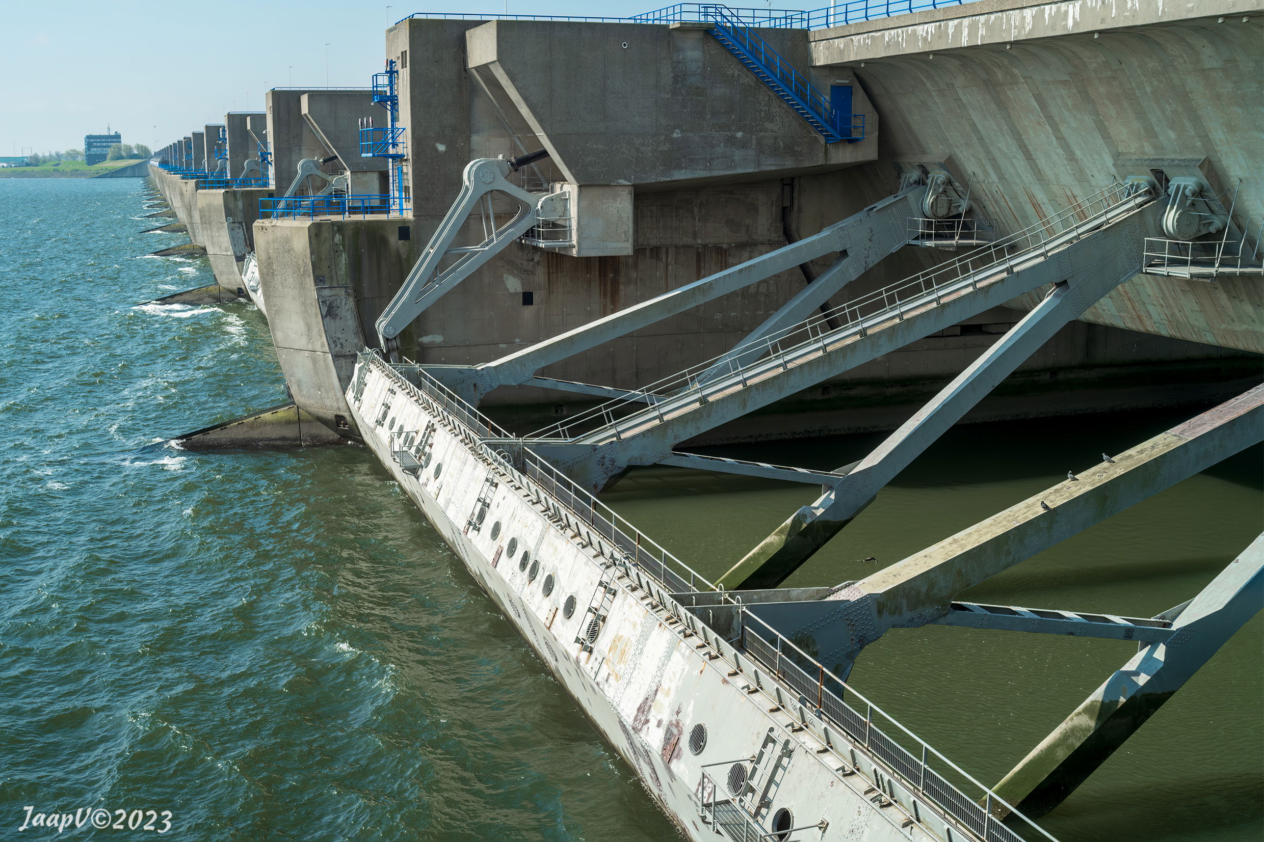 This dam (Haringvlietdam) controls the flow from the Rhine river into the sea and the intrusion of salt water through high water from the sea - and of course to protect the low areas (I live at -2 m.) during storm floods.The 17 doors over a length of 4.5 km control 30 billion cubic meters of water yearly and the doors open and close individually according to the water flow. The concrete blocks contain special tunnels for fish to pass.