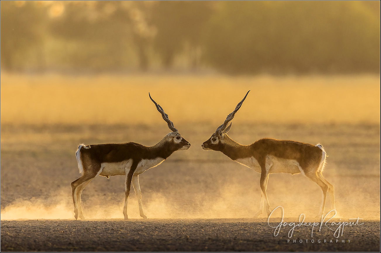 Really wonderful image Jagdeep. As others have mentioned, love the face off between the bucks, the golden light, and swirling dust. A fine capture.