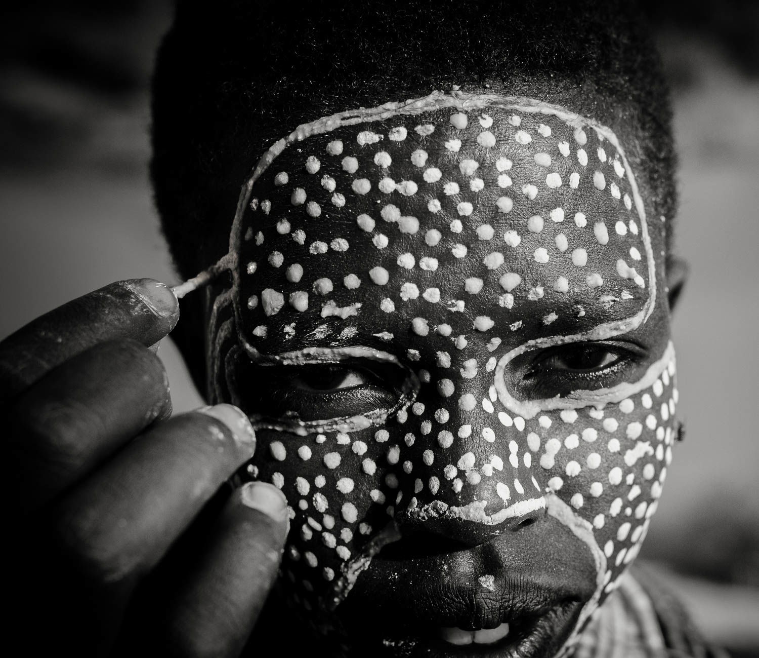 In the tribal areas of southern Ethiopia, photography is pay for play. Kids expect to receive 5 Birr per photo (about 20 cents US) and adults expect 10 Birr. Facial painting is done in order to attract more photographers. Here’s a photo taken when one youngster was having her face painted. I converted this to BW since it was taken near Noon in harsh light. I framed it tight to eliminate a distracting background.