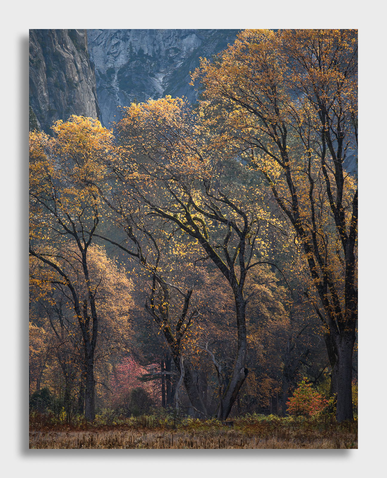 I provided a full frame version as well as a cropped in version. The full frame version provides a little bit more of “place’” as you are able to see some of the Yosemite granite walls. In the cropped in version, it’s more about the trees, the bending, and the colors.