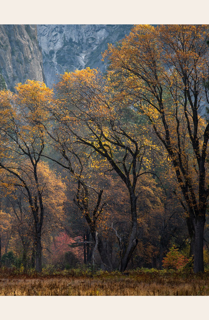 More Fall colors images from Yosemite a couple months ago. This scene was backlit in the early morning down on the valley floor. What intrigued me the most about this scene was the combination of Fall colors being backlit and the bending tree trunks which, at least to me, give this scene a little whimsical feel and look to it. A little bit like my last tree from Yosemite that looked like it was dancing. I get that same feel out these trees.