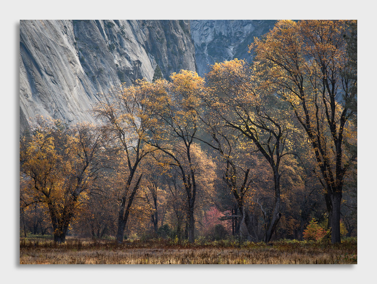 I think you could brighten up the foreground grasses and the oak leaves just a bit and also burn down the bright spot in the granite just above the left-most oak. It won’t take much for either one.