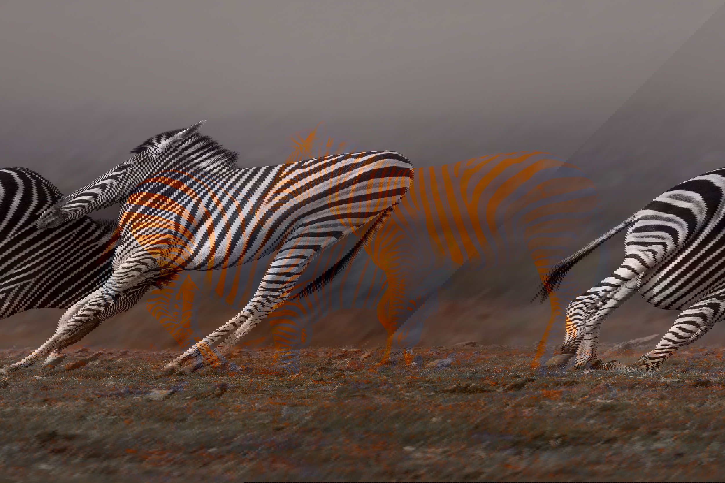 Taking advantage of the deep orange red sunset, creating a warm photograph of two zebra’s fighting while making the barren background and foreground obscure.