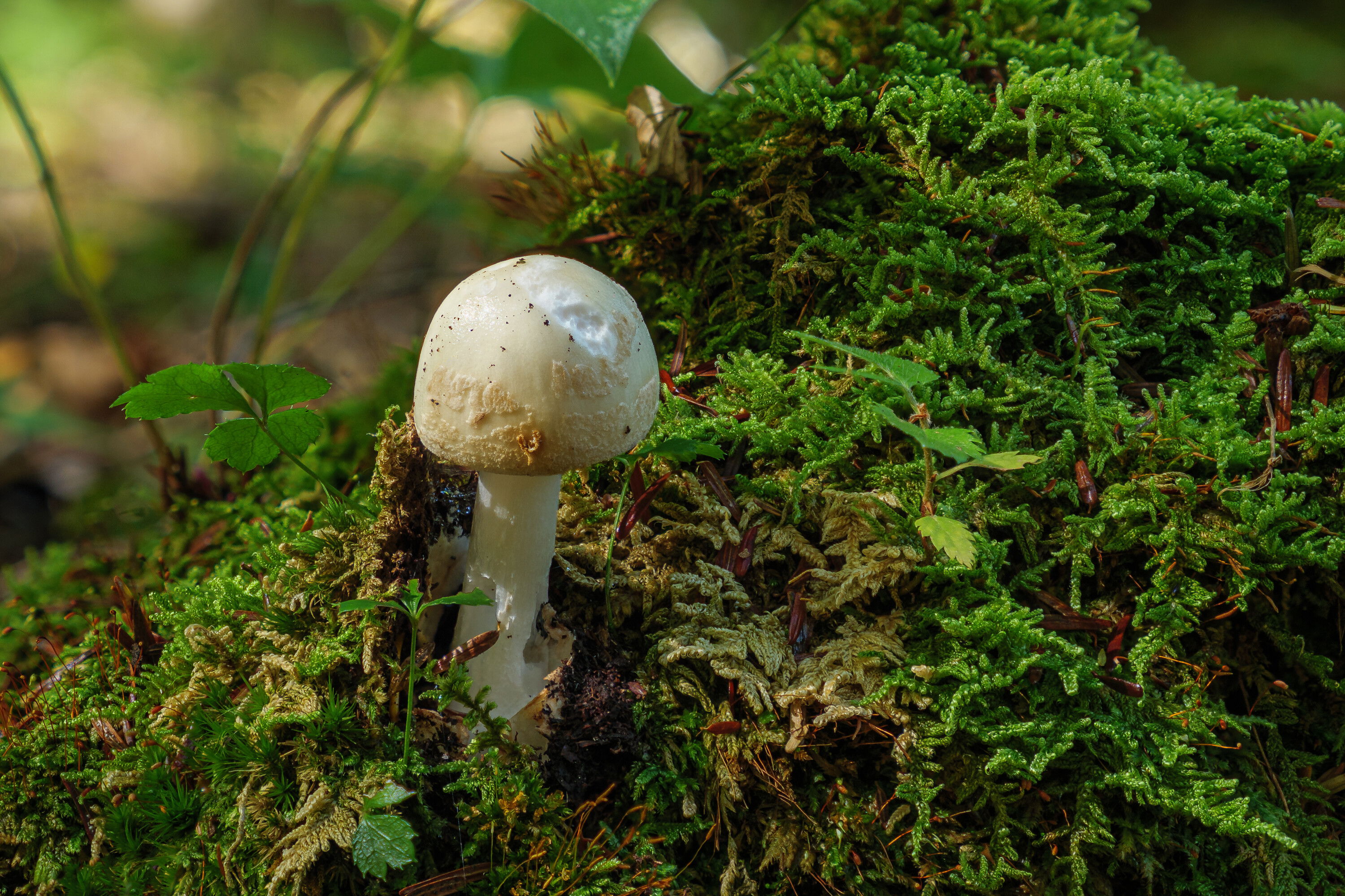 Frankly, so did I, but when I went out again in late September, there were still mushrooms around and some newly fruiting like this young Amanita. I stupidly forgot my macro lens, but the Lumix 12-35mm f/2.8 focuses quite close so I could get right in there. It’s fruiting on a log and I couldn’t resist all that moss. And something couldn’t resist a nibble. Funny how something probably deadly to humans can be food for other creatures.