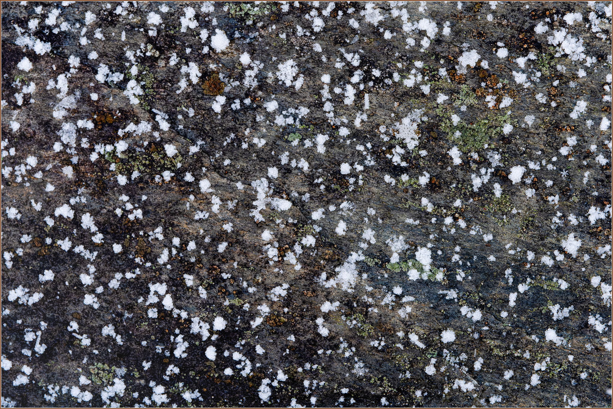 I wasn’t sure whether to put this here or in Macro/Close-up since it’s probably ~8" wide. However, the lack of any central subject made me decide it belonged here. Yesterday morning we had had nice freezing weather overnight and just the lightest fall of snow. I noticed it on the birdbaths when I went out to de-ice them and immediately came back for my camera. I did take quite a few photographs of the flakes on the birdbath ice, but also photographed this flat rock beside our pond. I didn’t notice all the lichen on this until I processed the image and didn’t expect this much since this slab is probably only 15 years out of the quarry.