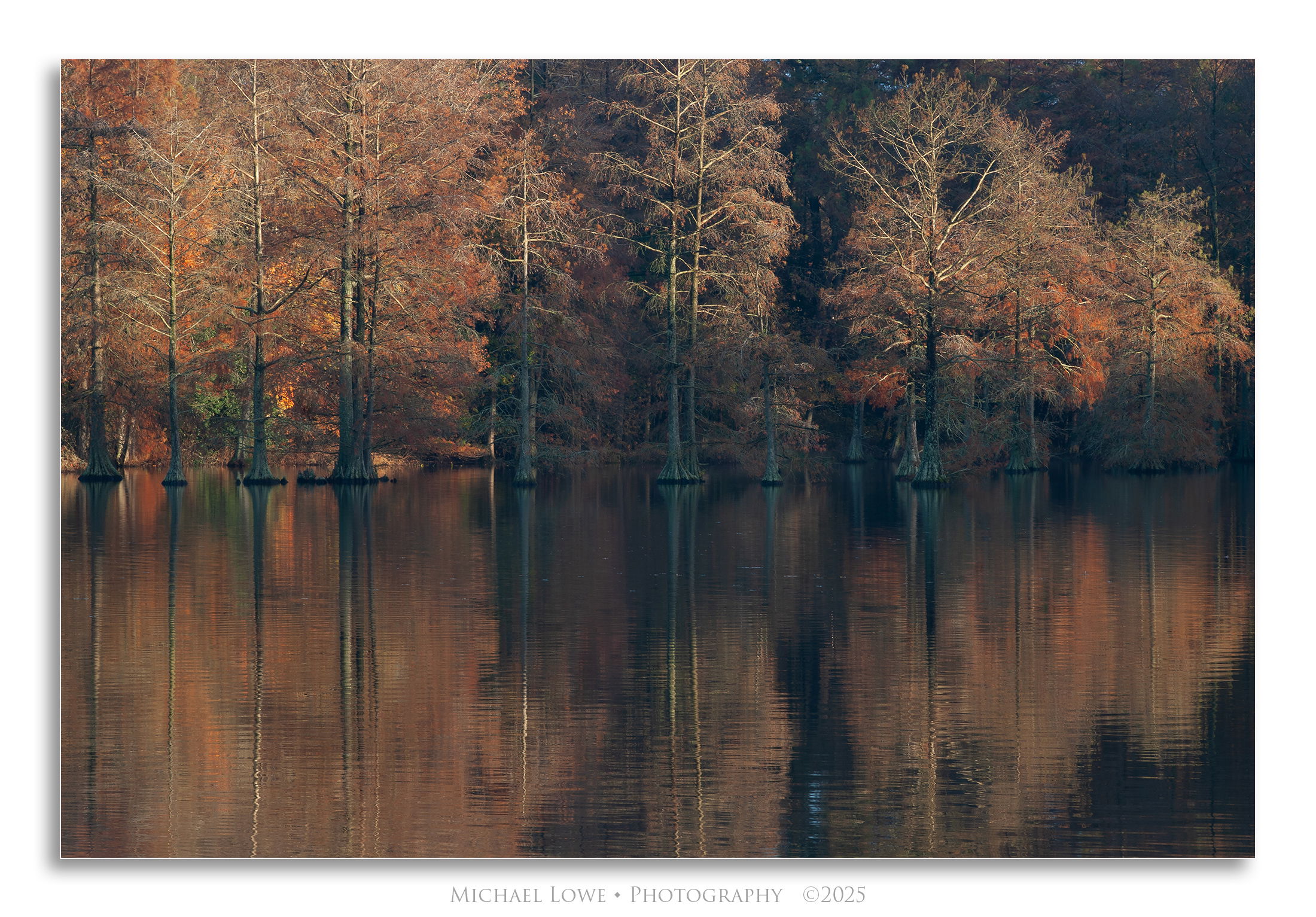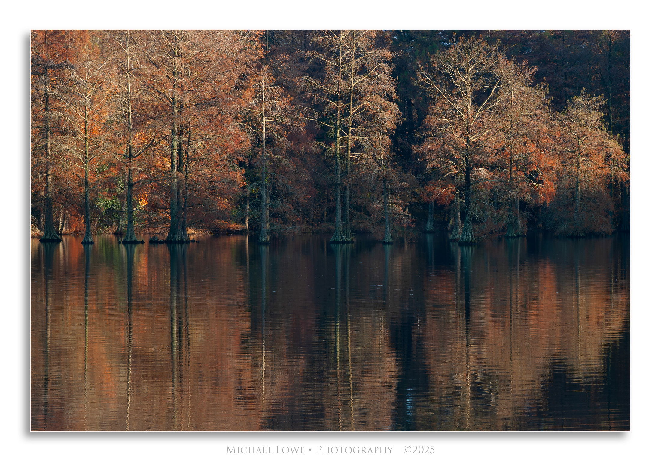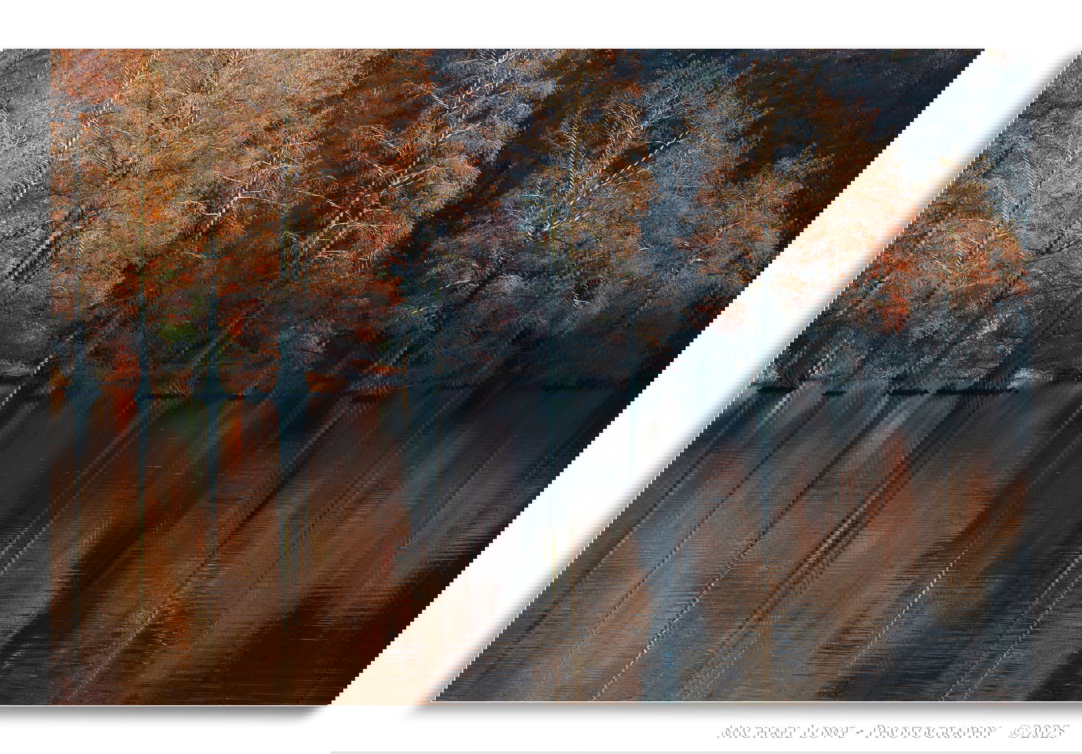 Gorgeous light is what makes this image sing, Michael. The lit trees in the foreground contrasting against those unlit trees on the background hillside really bring this image alive. The colors in the trees and the reflection in the water are sumptuous. I love that the trees are mostly bare offering up beautiful structure and highlighted limbs.