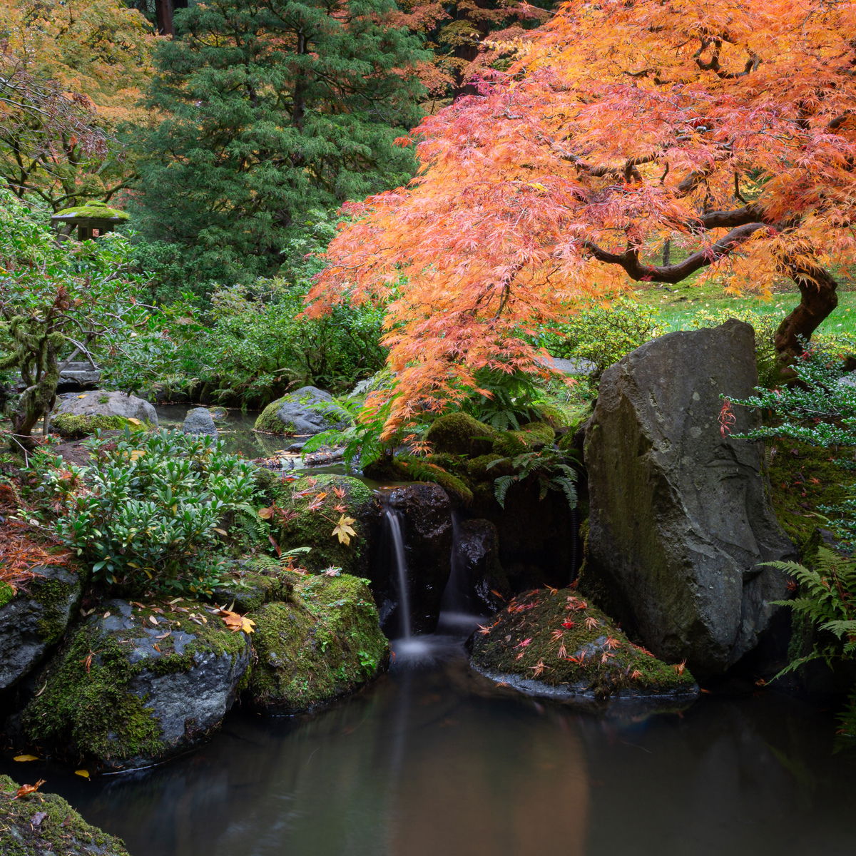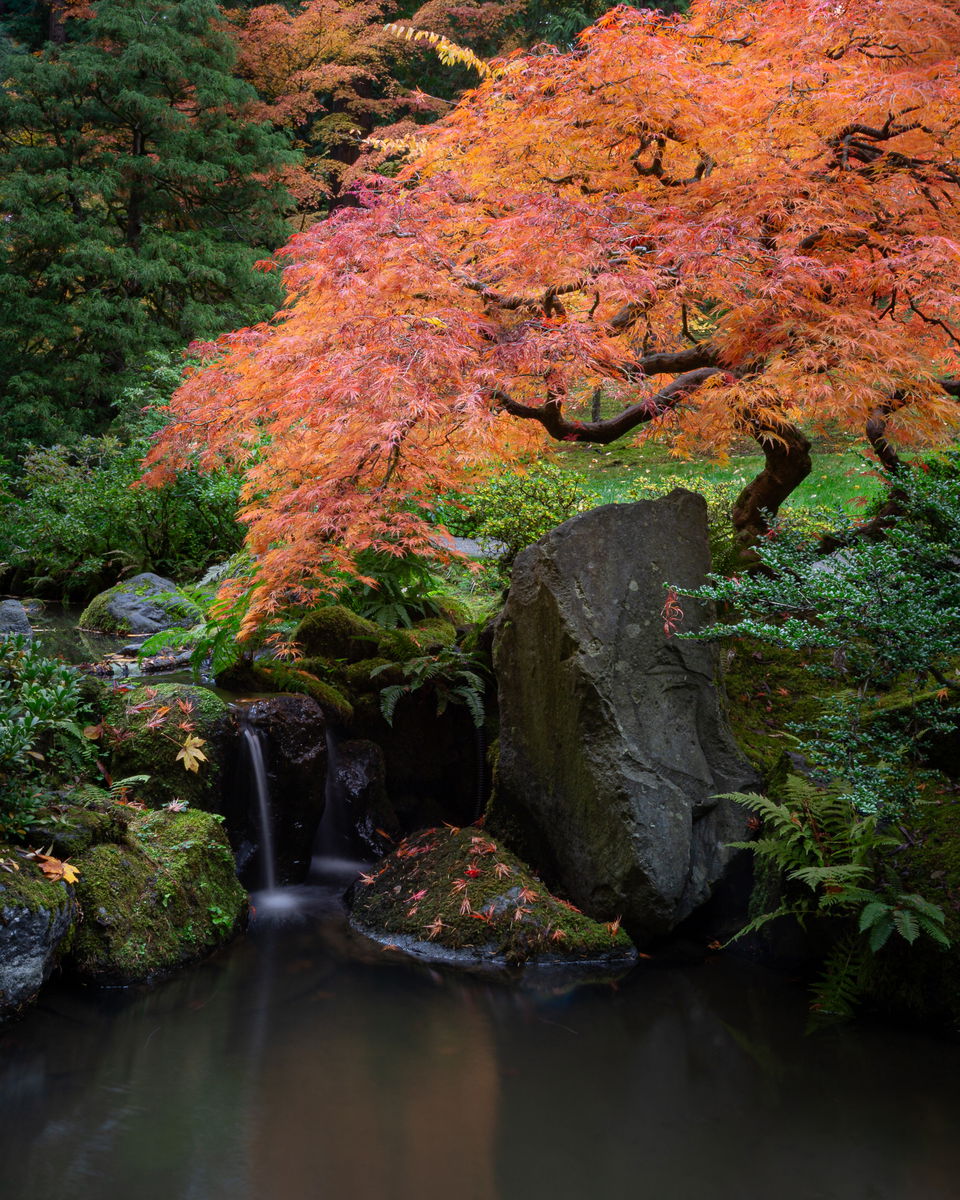 The other comp is a vertical 8x10 that makes the tree truly the subject. I do have a tendency to love a little thing in a frame so much that I make more of it than it can really hold (think mushrooms in my other images from the garden), and in this composition, I give up that lantern to let the tree shine on its own with the tiny waterfall.