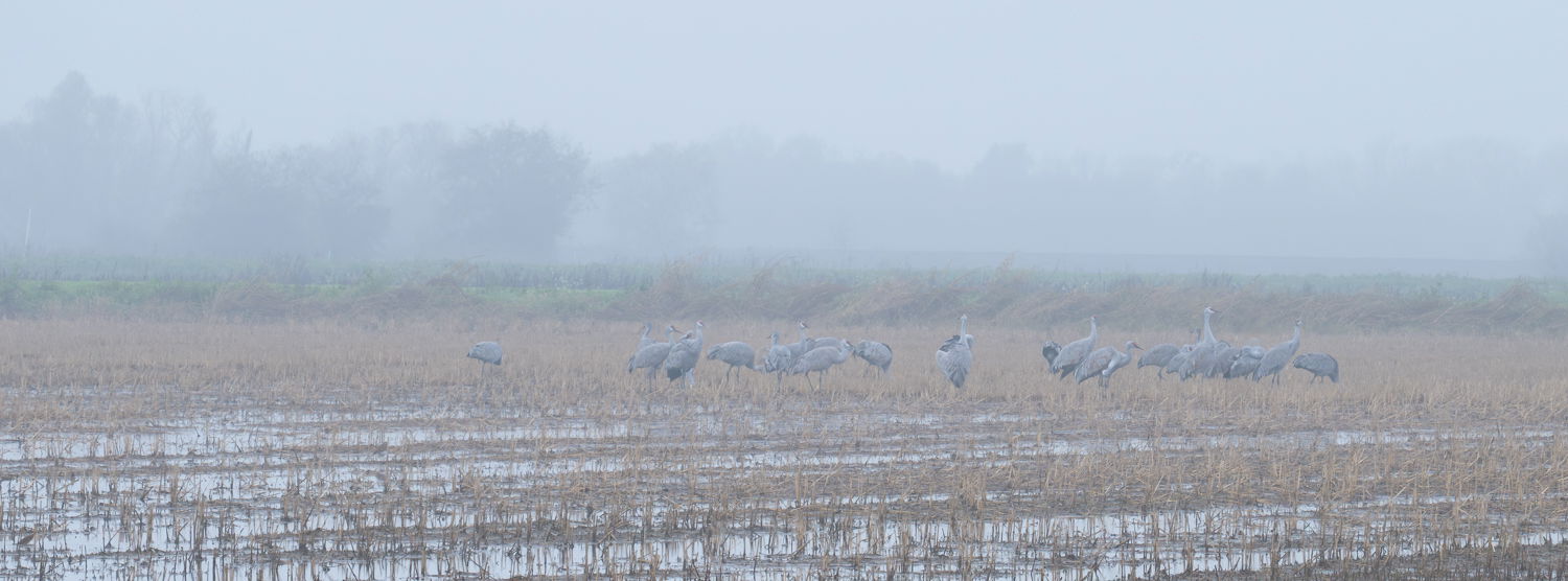 The fog was beginning to lift so I packed up and started heading home. Less than a minute after I started driving away, I spied a small flock of sand hill cranes settling down for the day in a nearby field. [That’s all it took!!]
