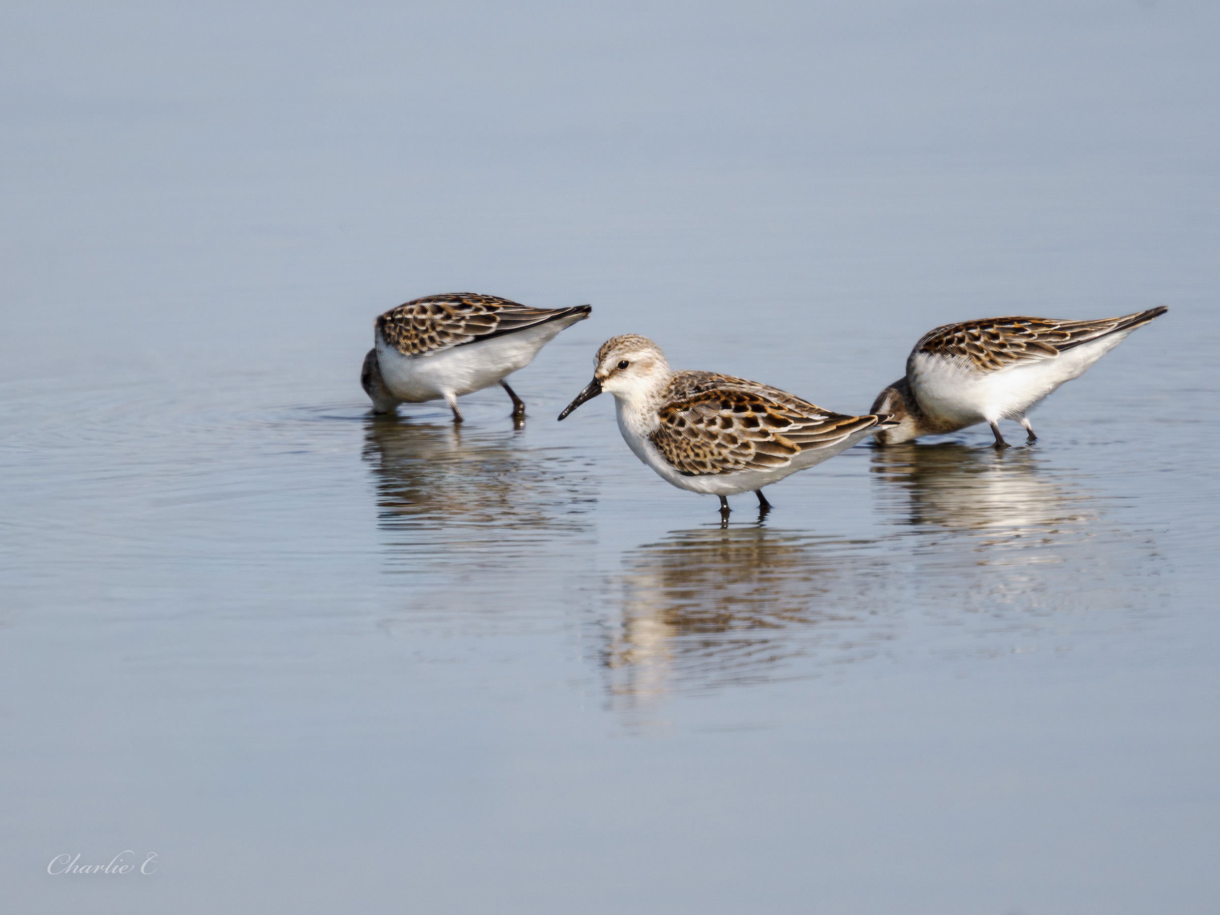 Small flock of sandpipers working the edge of Drayton Bay at fairly high tide. At least it kept them close to shore. At low tide it is a huge mud flat.