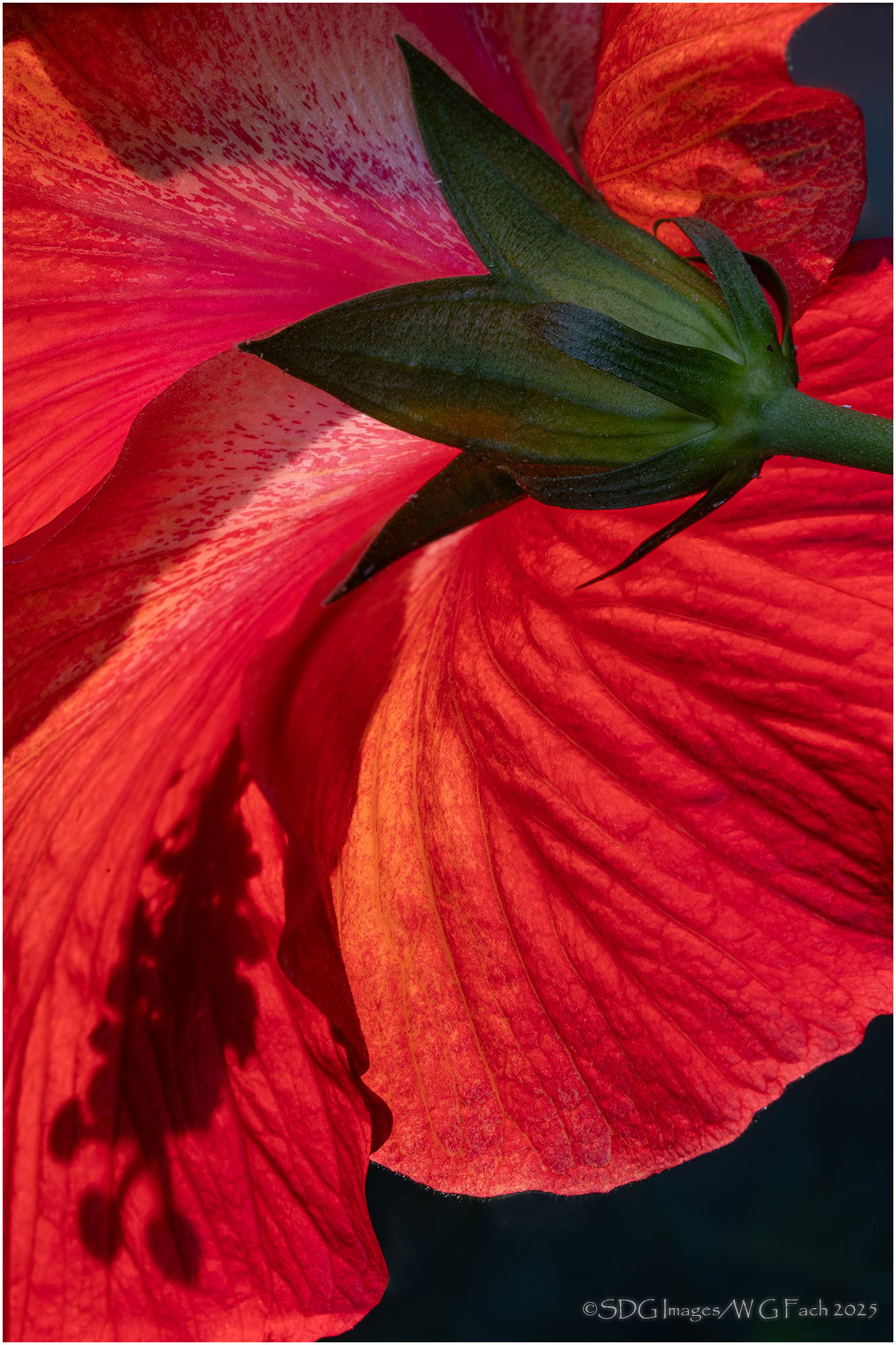 This hibiscus lives on our back patio and has been a prolific bloomer all year but today is one of the very few days in the year where the lighting all came together. The patio is on the west side of the house and in shade at sunrise but for the past week as the sun has shifted south it shines through our east facing front door and through the French doors leading to the patio to give me this front and backlighting. Serendipity was enhanced by perfectly calm conditions that let me do some different comps with more extensive stacks. Perhaps I’ll post them later.>=))>