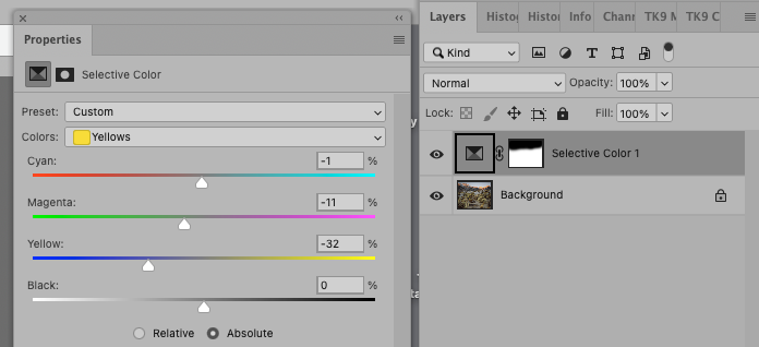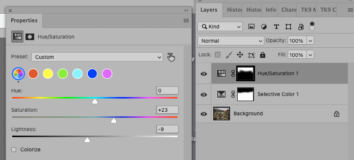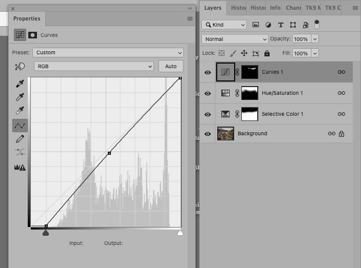 I would try a different approach, as there is too much loss of contrast in the methods used, and the mask edges are too obvious. I don’t know how the FG bushes should look but I tried a selective color and on the layer’s mask I painted out the effect of the peaks.