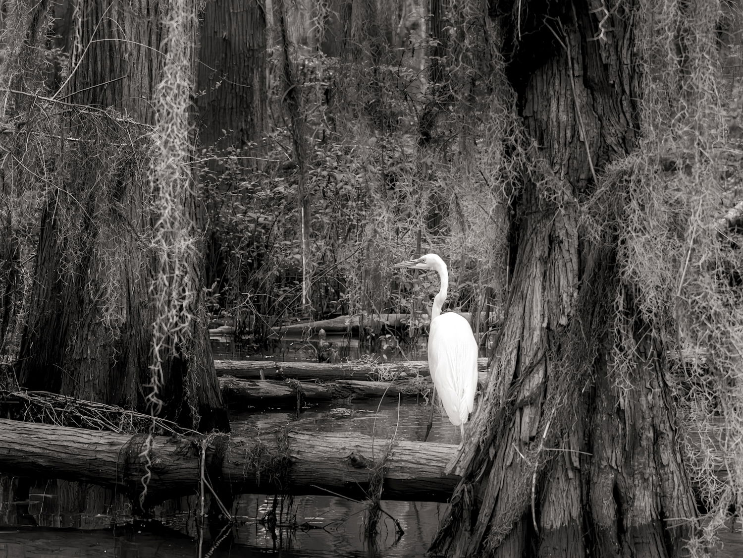 I noticed this Great Egret in this still pose amongst the Cypress trees as I was floating through the bayou. After processing the raw image in color I decided to try a black and white conversion. I felt that removing the color added emphasis to the white bird, helping it to stand out in its environment.