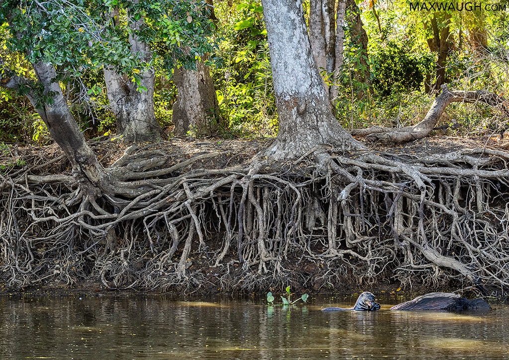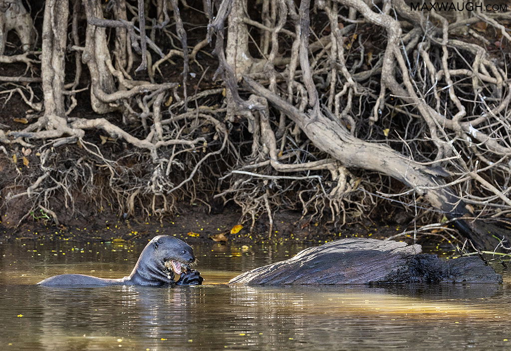 This is one of my favorite spots in Brazil’s Pantanal. Every time I visit this small canal and pass these roots, I wish for a wildlife subject to place in front of them. A few years ago, I finally got a jaguar here, and this year, it was a giant otter’s turn.