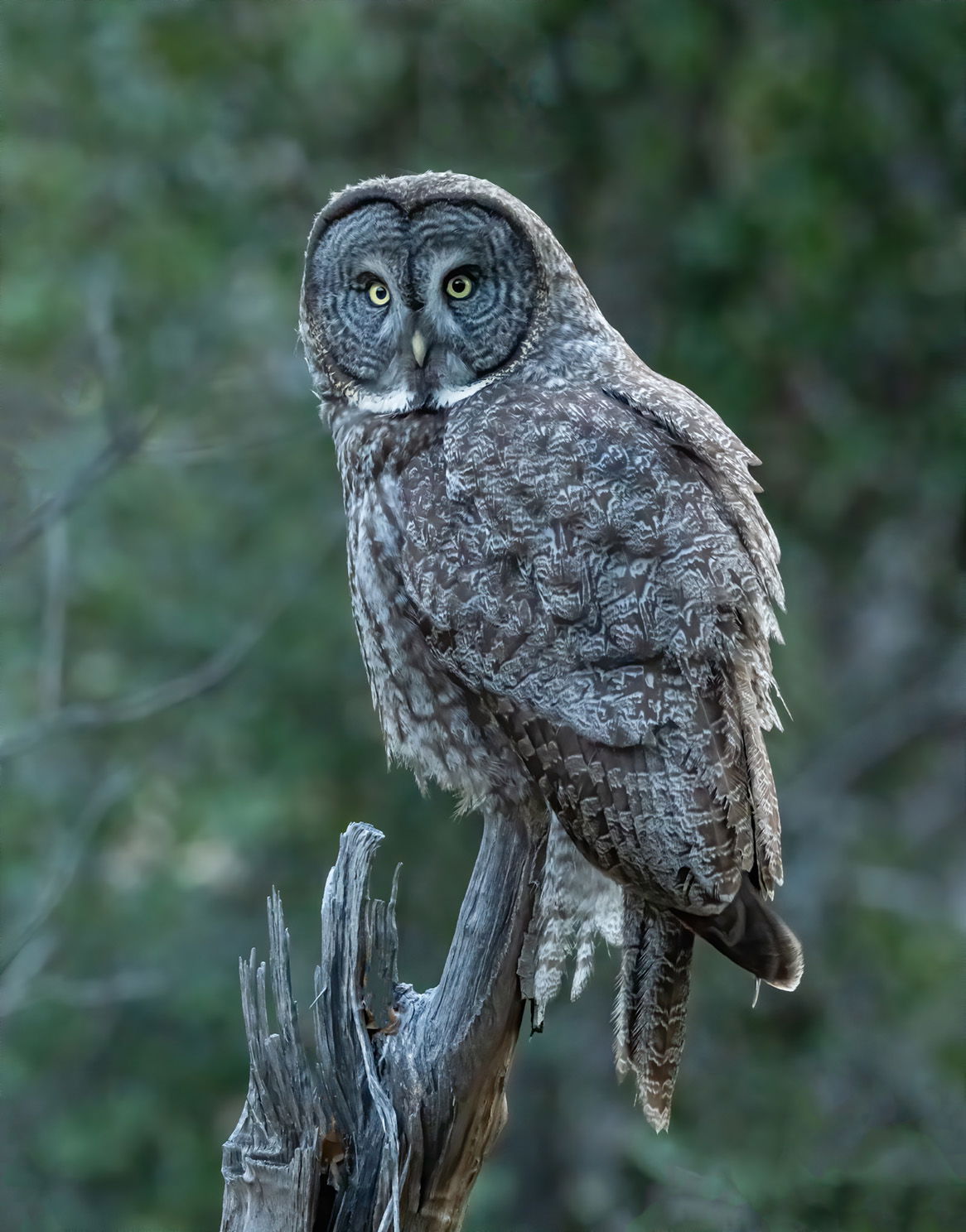 I have a pal that’s been seeing a rare great gray owl so he took me out where he’s been seeing it and, lo and behold, there it was. It let us photograph it on two different perches for over a half hour! I had to make some “lip-squeaking” to get it to look at me. This is one of the 56 “keepers” that I got. It was late evening diffused light. Unforgettable.