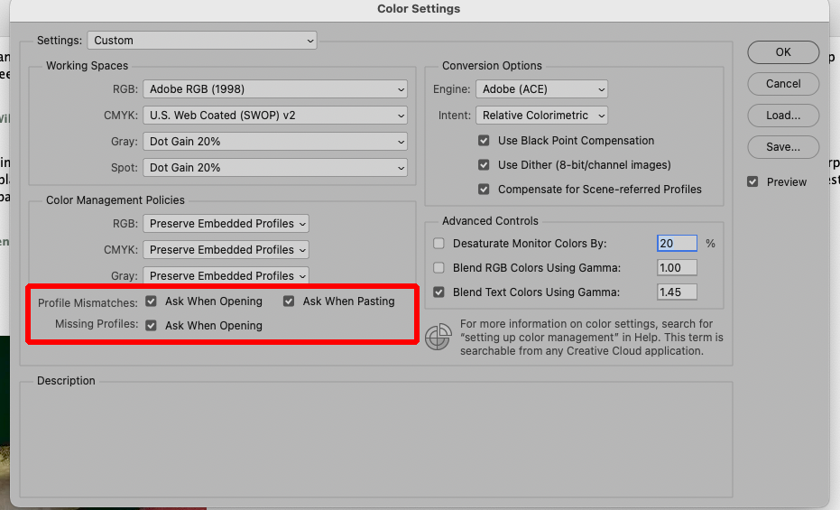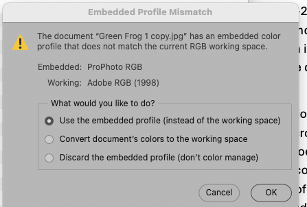 I have PS set (as it should be for everyone) to warn me if an image I open is in a color space different from my working space. Here’s what I see when I download and open this image, and the right answer is to convert to my working space.