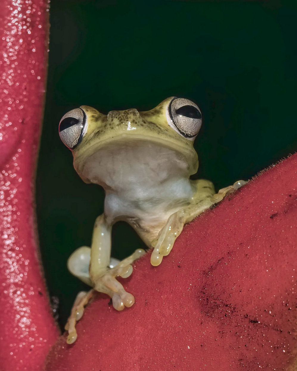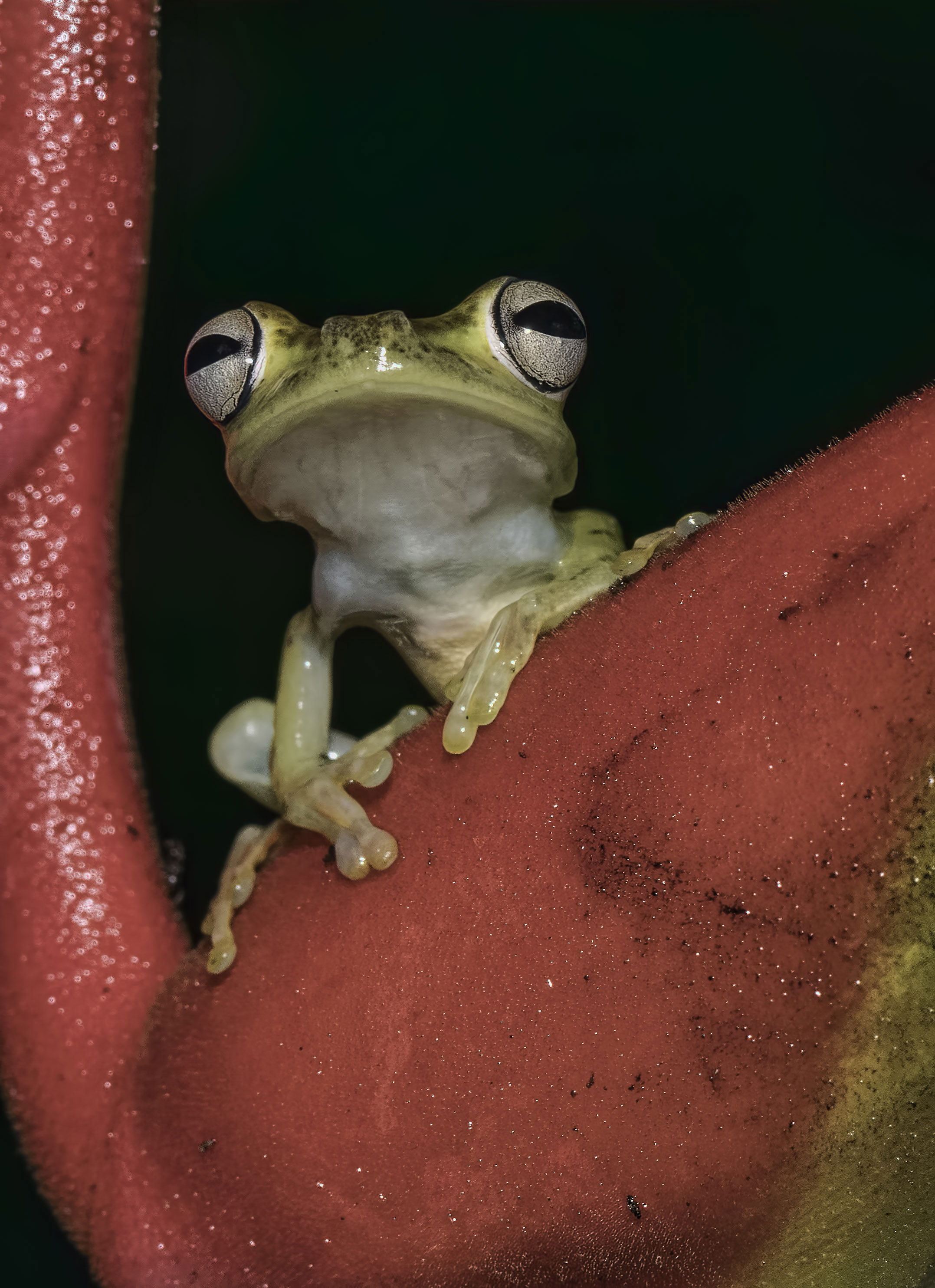 This is a really nice image for probably more reasons than I can think of. The things that I find really interesting are the interesting subject, the overall sharpness and depth of field, the framing by the red plant?, the perfect black background, and the perspective which seems like you are at eye level with the frog. The one very minor suggestion I would have would be to darken the bright sparkles in the red on the left side of the screen. To me they are a very slight distraction.