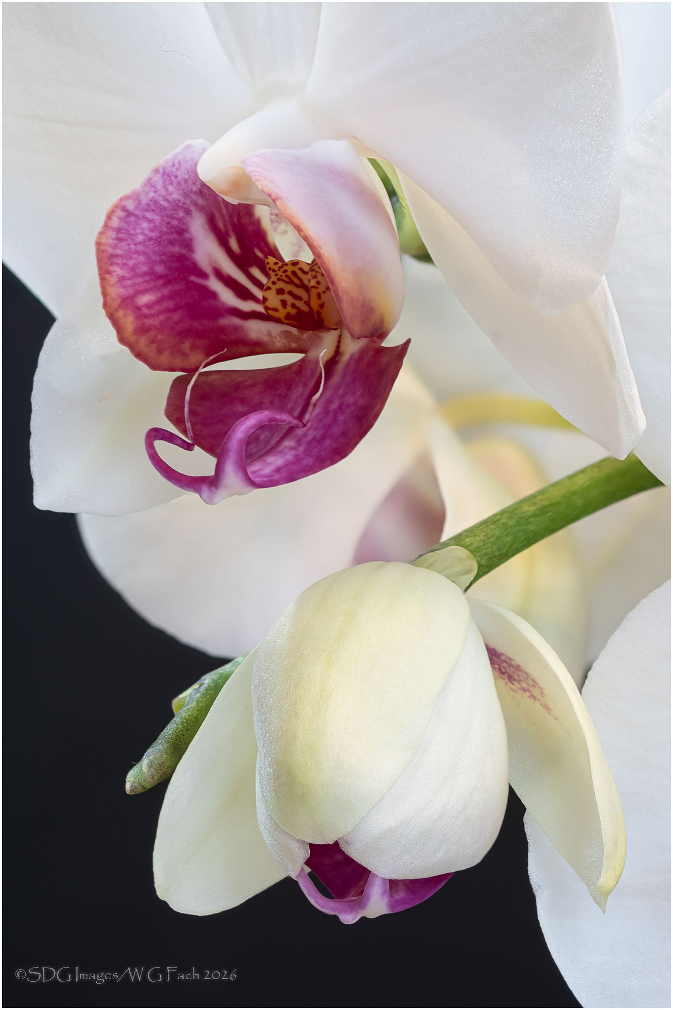 I often think the center of orchids look like an angel with its wings spread so I liked how the full bloom was kind of overlooking the emerging bud. >=))>