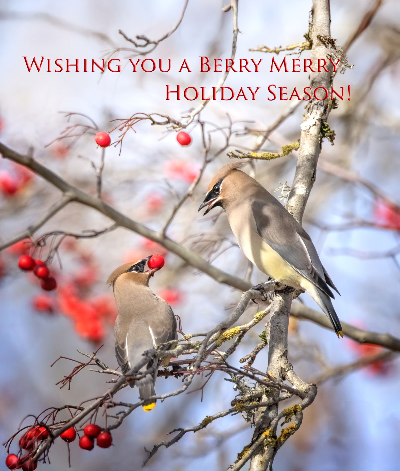 The birds (seemingly) exchanging berries is a well fitting gesture for your holiday season. But I really love the colour combinations working so well together. The tips of the waxwings match the lichen and the blues and reds are beautiful. The OOF BG is delightful.