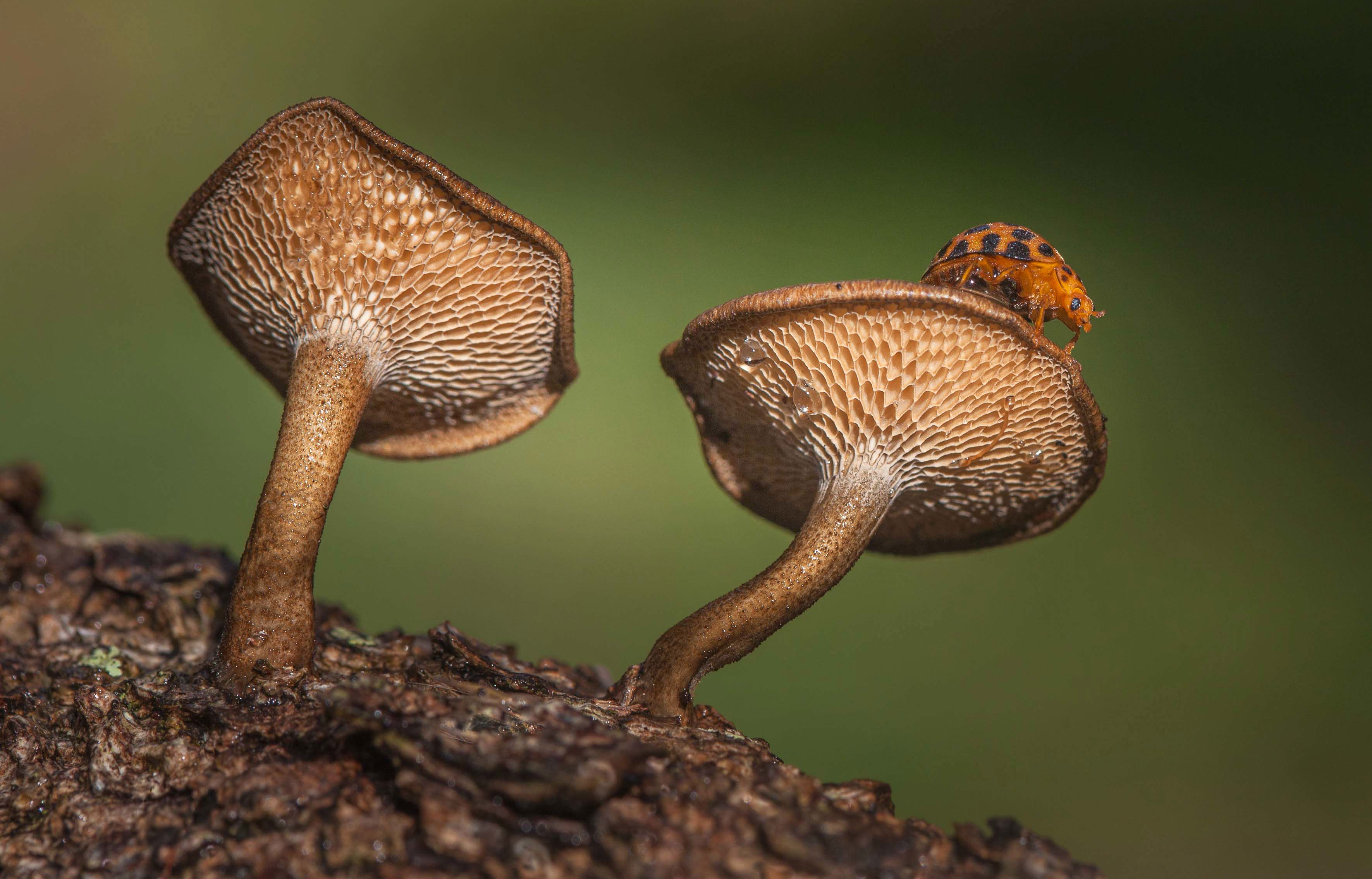 Glennie, the warm browns of the wood, the mushrooms and the lady bug make a stunning contrast to the greem background. The details in the pores is an excellent addition as well.