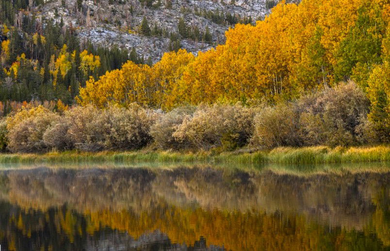 Now, for a tighter view of just the Fall colors you could crop down eliminating the mountain peaks and just focus on the trees and the reflections. In any case, you were witness to a stunning sunrise at North Lake.