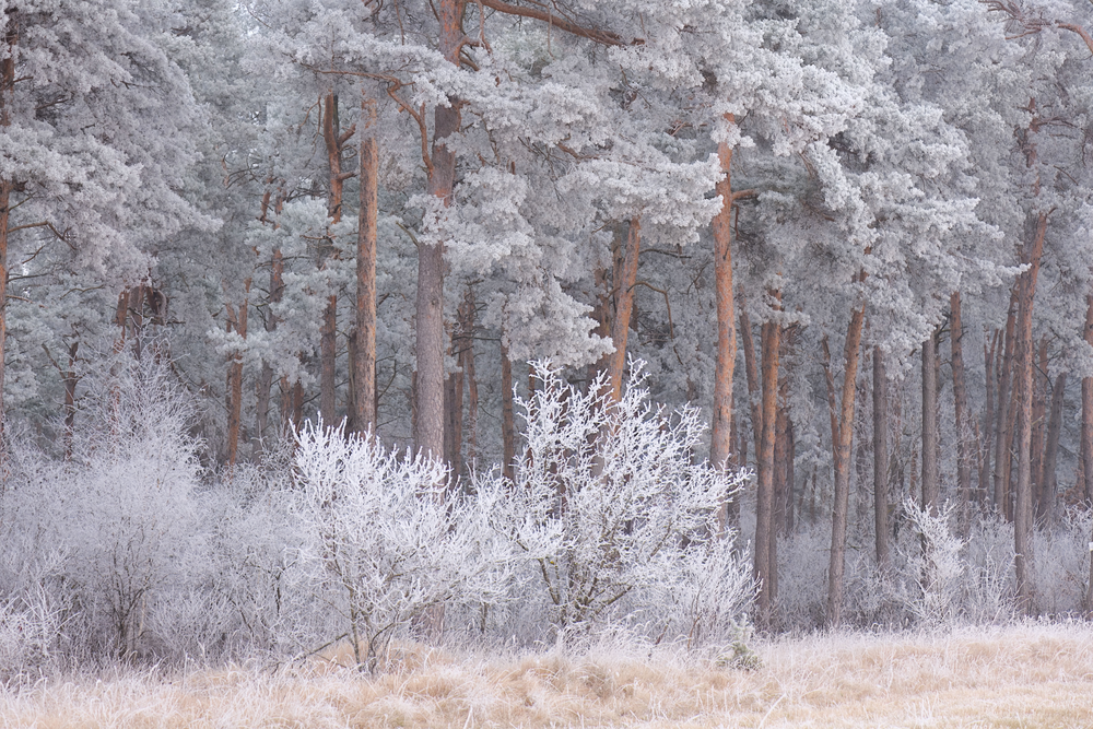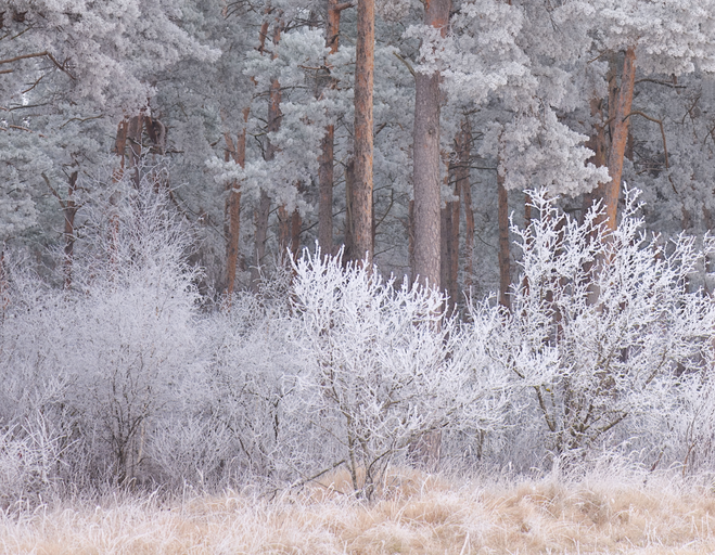 I love to shoot hoar frost too. It’s great you got it on 3 different things, the grass, bushes and trees and get to see how different it looks. The details look great, especially on the bushes. Compositionally, I am personally drawn to images with a focal point or pattern, so for my eye, it is hard to find a place to land in the image. I agree with a couple of the other comments about maybe trying to focus on just the trees, or moving in closer to get more detail and focus on a foreground bush. In this image I am more drawn to how the frost looks on the trees and the contrast with the color of the trunks.