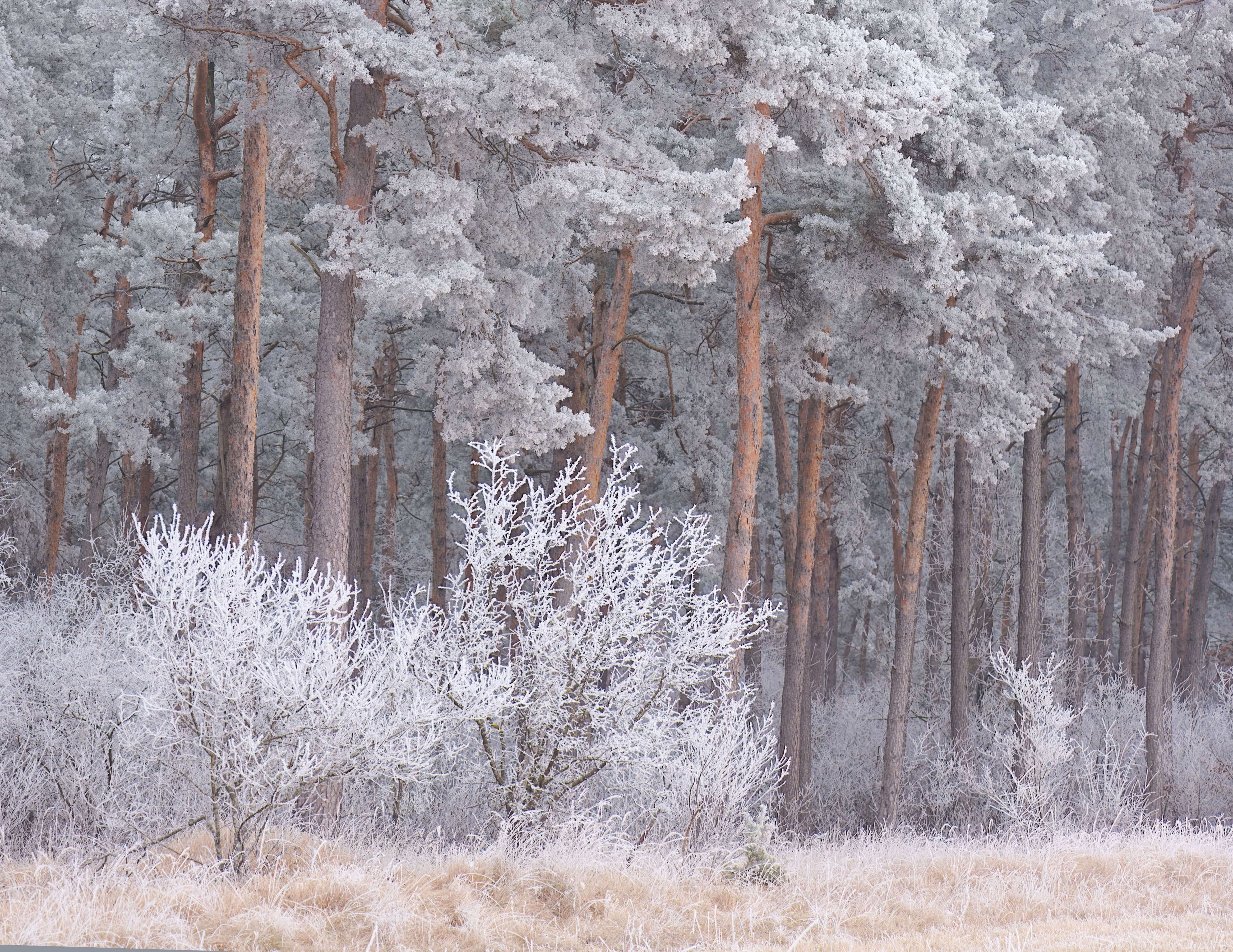 Kathrin, the mix of hoarfrost and warm tree trunks look great. I also like the grassy area at the bottom. I do wonder what else might have been there. It seems to me that the change from branches along the left edge to trunks along the right makes this view a bit right heavy. Could a modest change in position or camera angle have given you “all trunks”? I do think that the small trees/shrubs in the left half are important. What about a crop (losing the left) to 4x5?