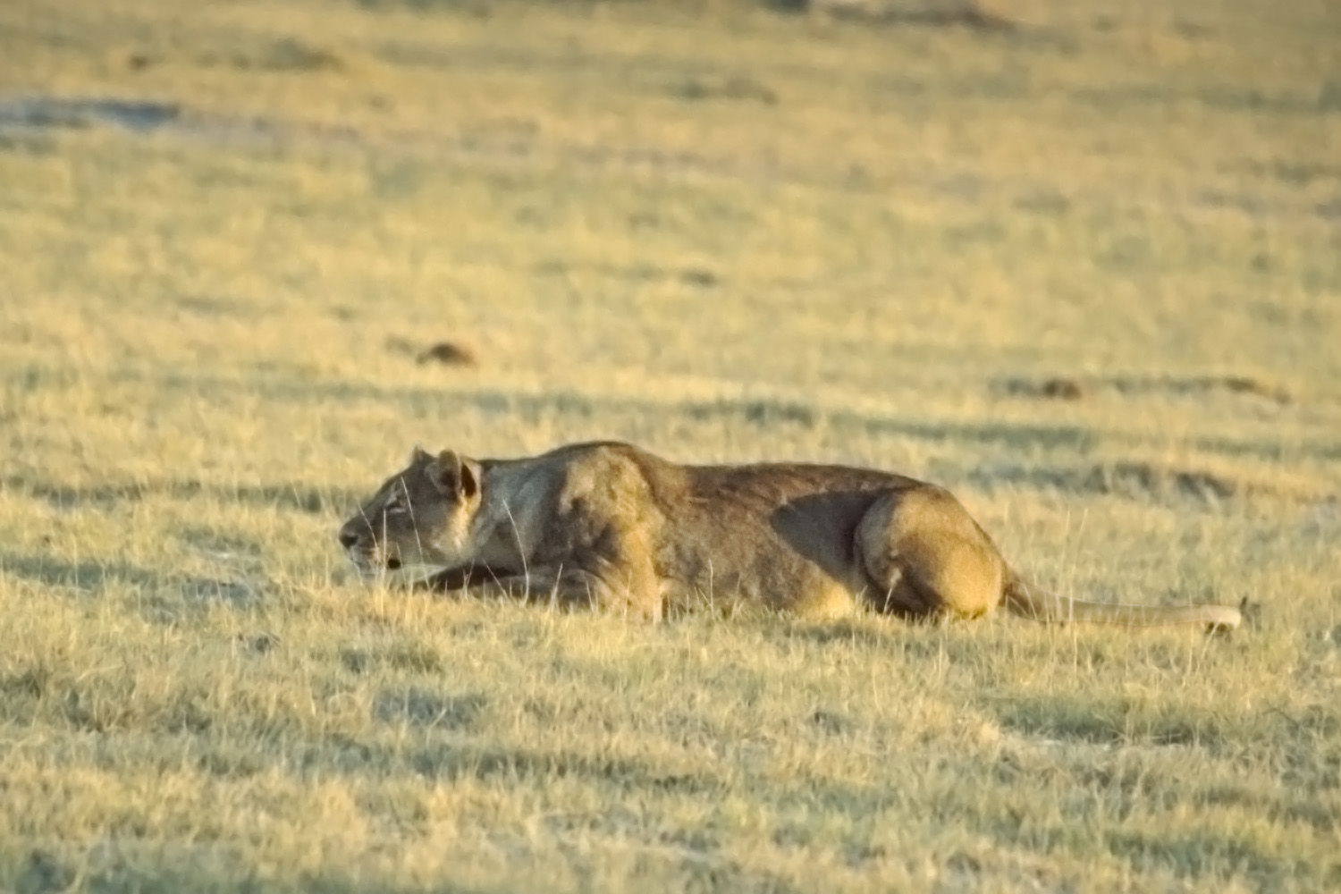 Alpha female lion (Panthera leo) hunkers down to minimize her visibility as she stalks an antelope. With relatively small hearts and lungs, lions are not fast runners; a maximum speed of 60kph, nor do they have the stamina to keep this pace for more than a 100 – 200m. As such, lions rely on stalking their prey and seldom charge until they are within 30m unless the prey is facing away and cannot see the charge.