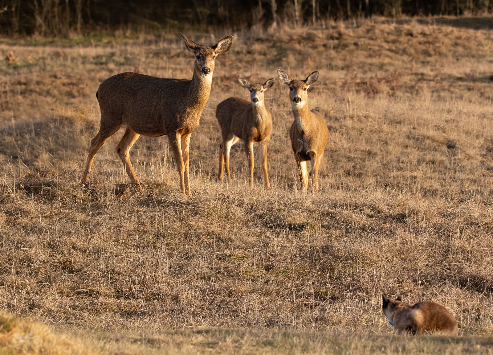 The other evening, my wife had our Siamese out in the back yard and the deer that hang out in our area came through. For awhile, she was actually amongst them, but she decided to exercise an unusual degree of discretion and move off. That was when my wife called me to come and bring a camera. This was the result. Not fantastic as I couldn’t get all the players in good focus, but it was fun.
