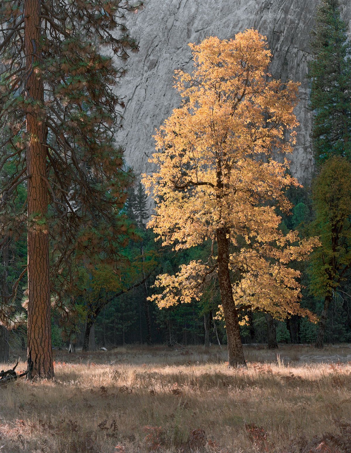 One of my favorite Black Oak trees in Yosemite Valley on a fine Autumn morning caught my eye from across the meadow. Fortunately, I had time to set up the 4x5 and make the exposure before the light blew out. The wall in the background is Middle Cathedral Rock.