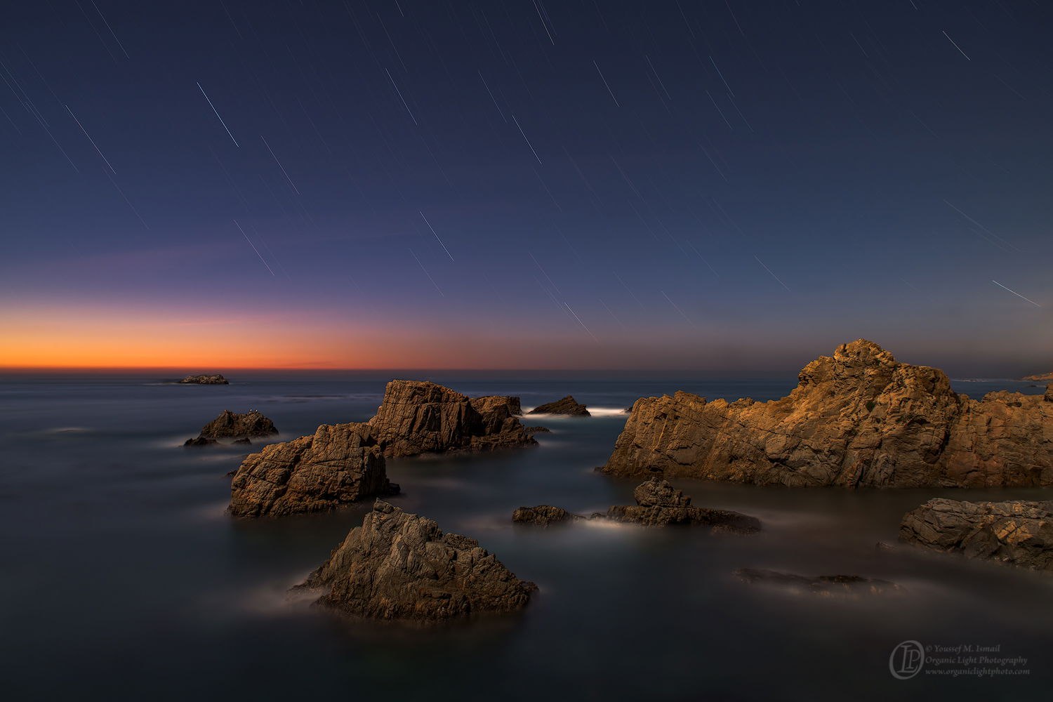 This was taken in pretty much the same location as the Blue Lemmon Aide photo from last month. but I scrambled down the cliff to get closer to the water. I intended to photograph the rocks after the sun had gone down and I wanted to capture the streaking stars this time rather than the stars themselves. So I opted for my wide angle lens at 24 mm. It was started about 40 minutes after sunset and was a single 20 minute exposure. I was unsure about running such a long single exposure, as when digital cameras first came out long exposures like this were terribly noisy but I guess the newer sensors have that figured out. The afterglow of sunset comes through on the horizon and I think it also affected the light coming from the moon as that was the main light on the scene and gave a very warm glow. I made another photo later in the night when the afterglow vanished and its a much colder color balance. I’ll post that other photo later.