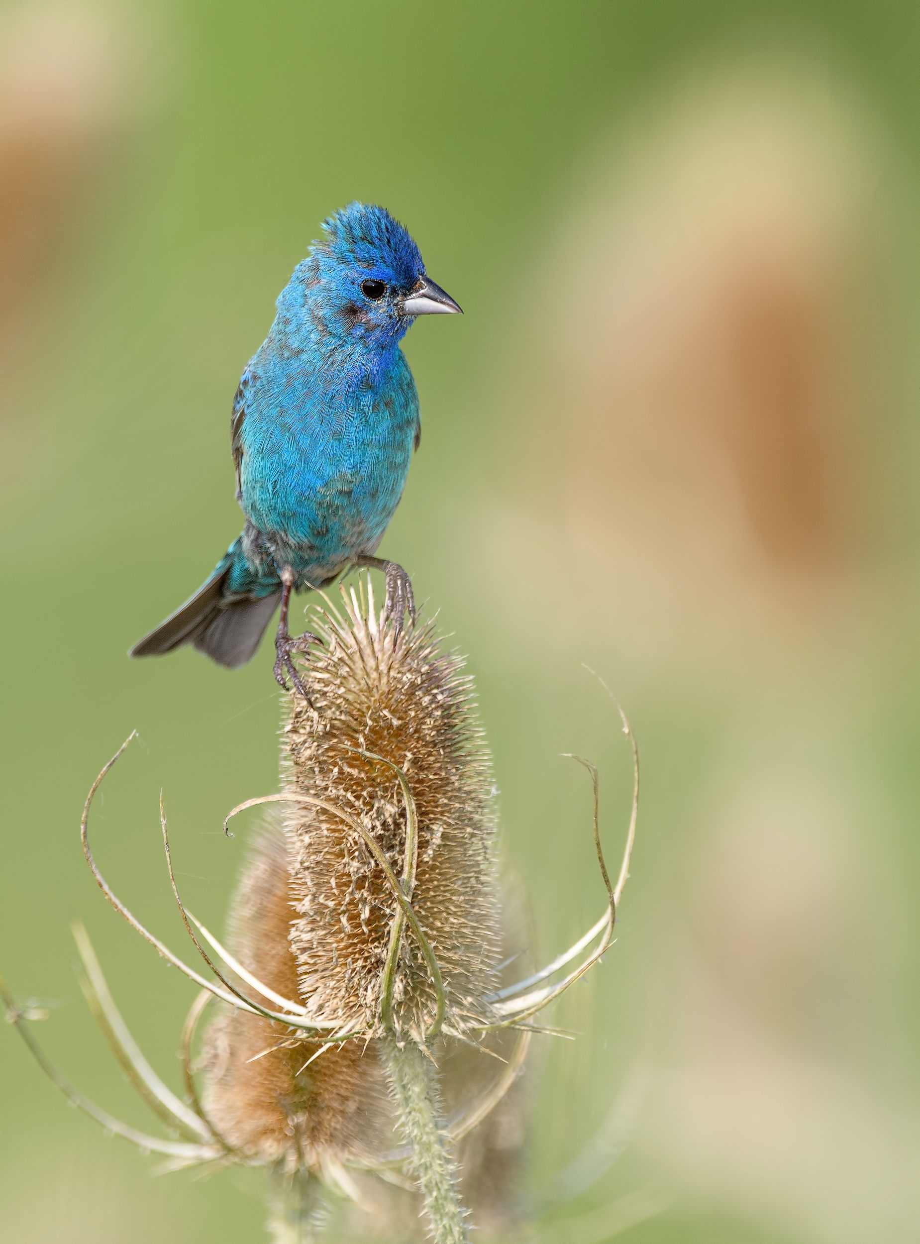 Excellent job on the color, pose and perch (good DOF on the perch). A little oversharp on the plumage; images on the new site are considerably sharper or sharpening algorithms tend to display artifacts more easily. I am in the process of fine tuning my images. Although I like the DOF in general, the OOF teasel on the far right does grab my eye. I would either decrease the color contrast in that area or blend the brown out to make it less conspicuous.