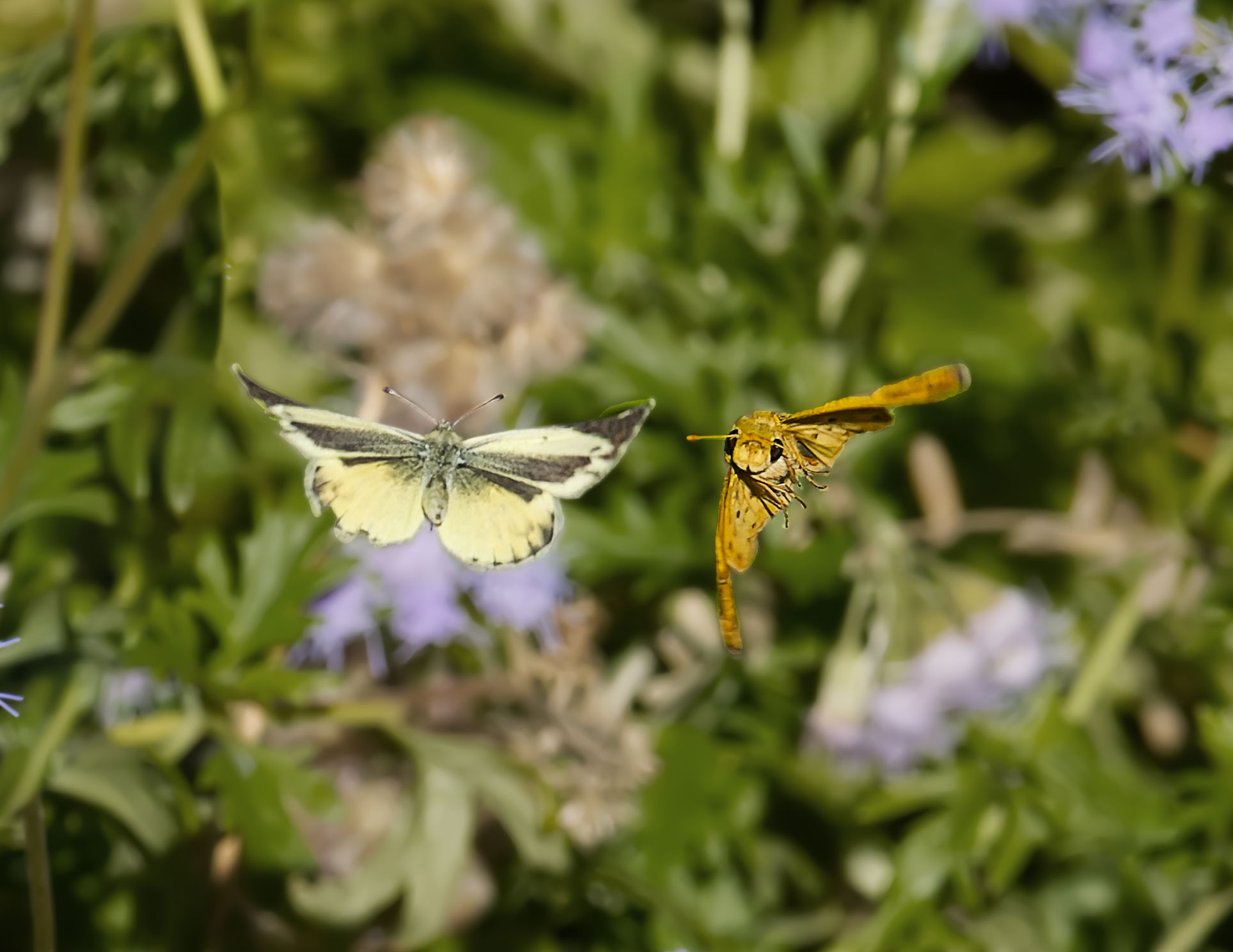 Here is a very unusual photograph of two tiny butterflies in flight. We have a Fiery Skipper attacking a Dainty Sulfur. This is known as interspecific aggression.