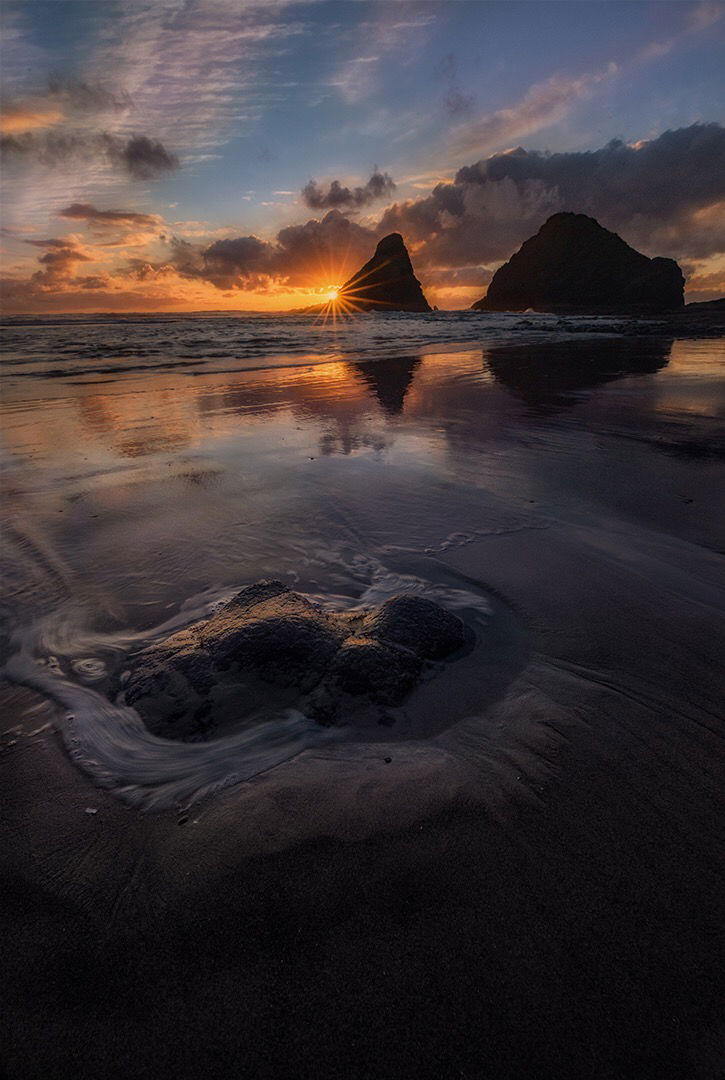 This is one beautiful coastal sunset. Love the sky and the expanse of the glassy beach really gives this some depth; as mentioned, a great near/far comp. The sun star, an almost subtle, but very important element to the scene.