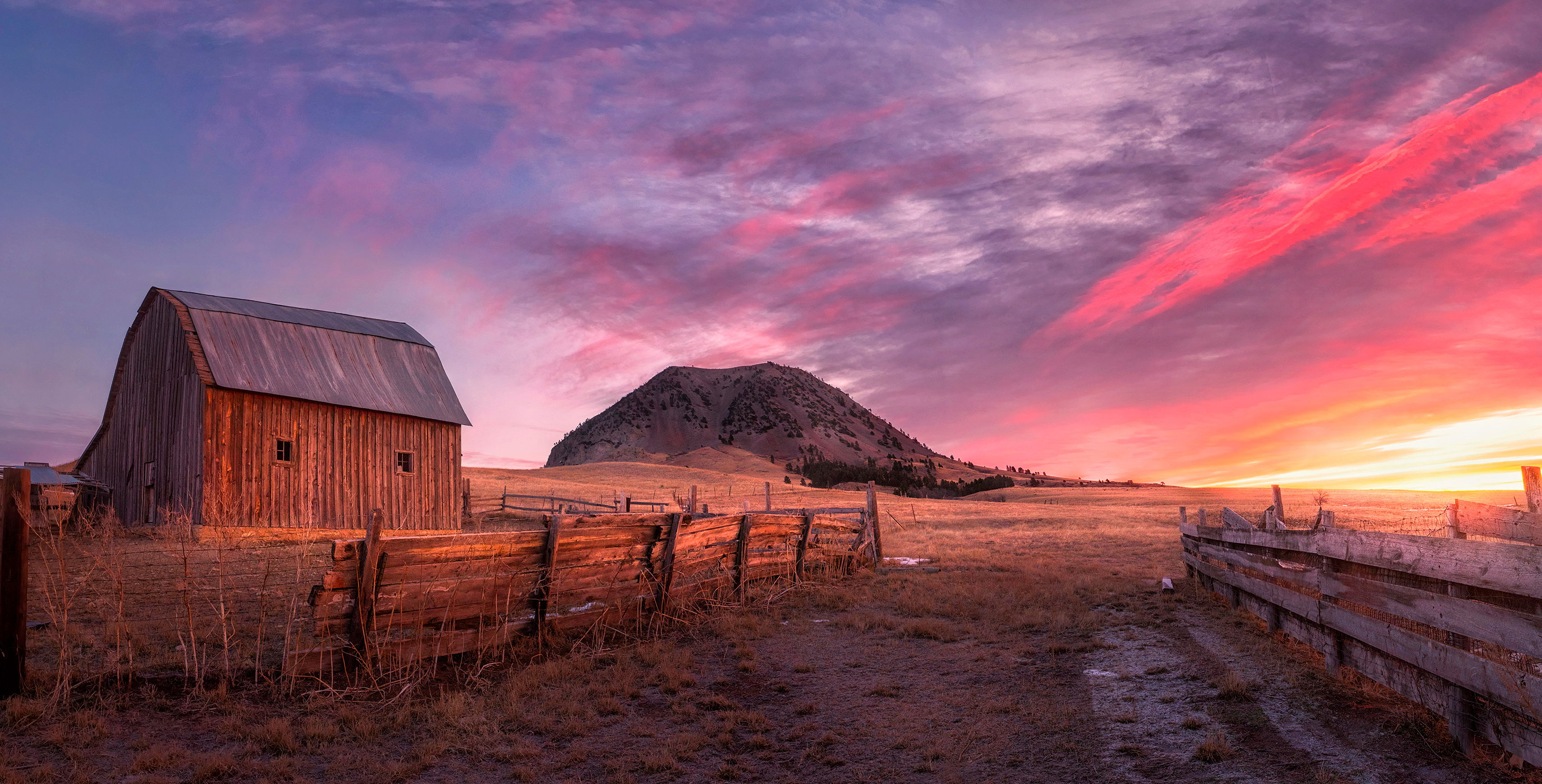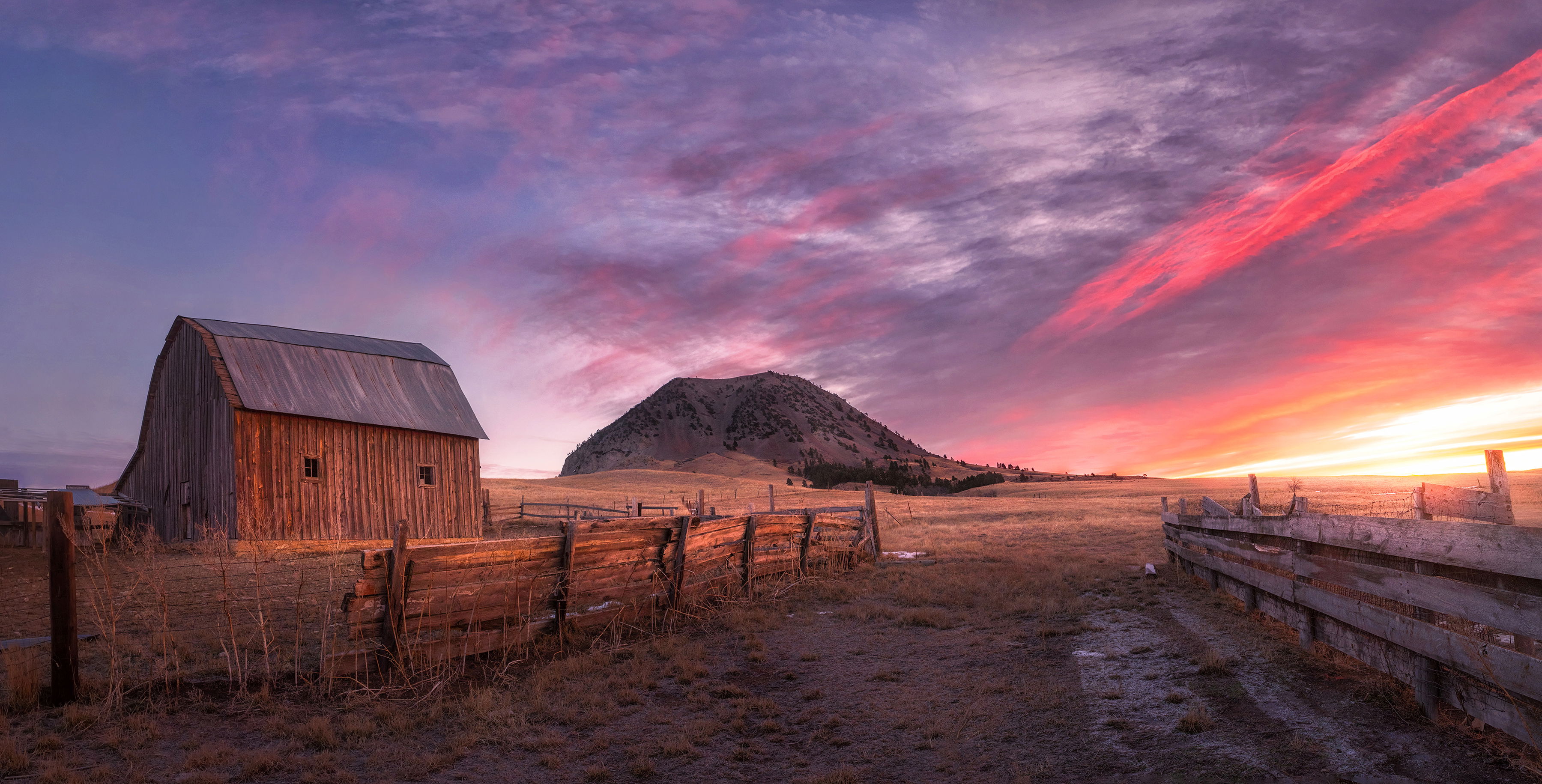 This is a really nice shot and I don’t have much to add to what Richard has already said. I don’t know if it was possible but in an ideal world I would like to see the butte centered in the opening in the fences. As to your questions, I think that the barn looks fine and I would leave the fence post as is.