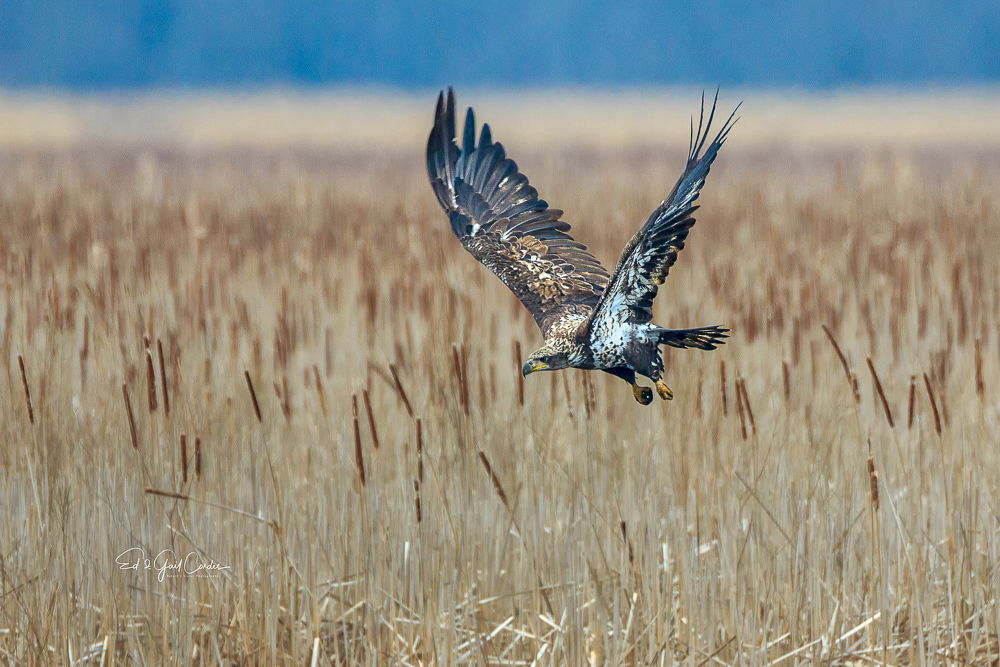 A nice in-flight capture, Ed. I’m thinking a slight proportional crop on bottom and right would provide a less centered composition and also enlarge the bird for more detail. It would also remove some of the broken grasses on the bottom.