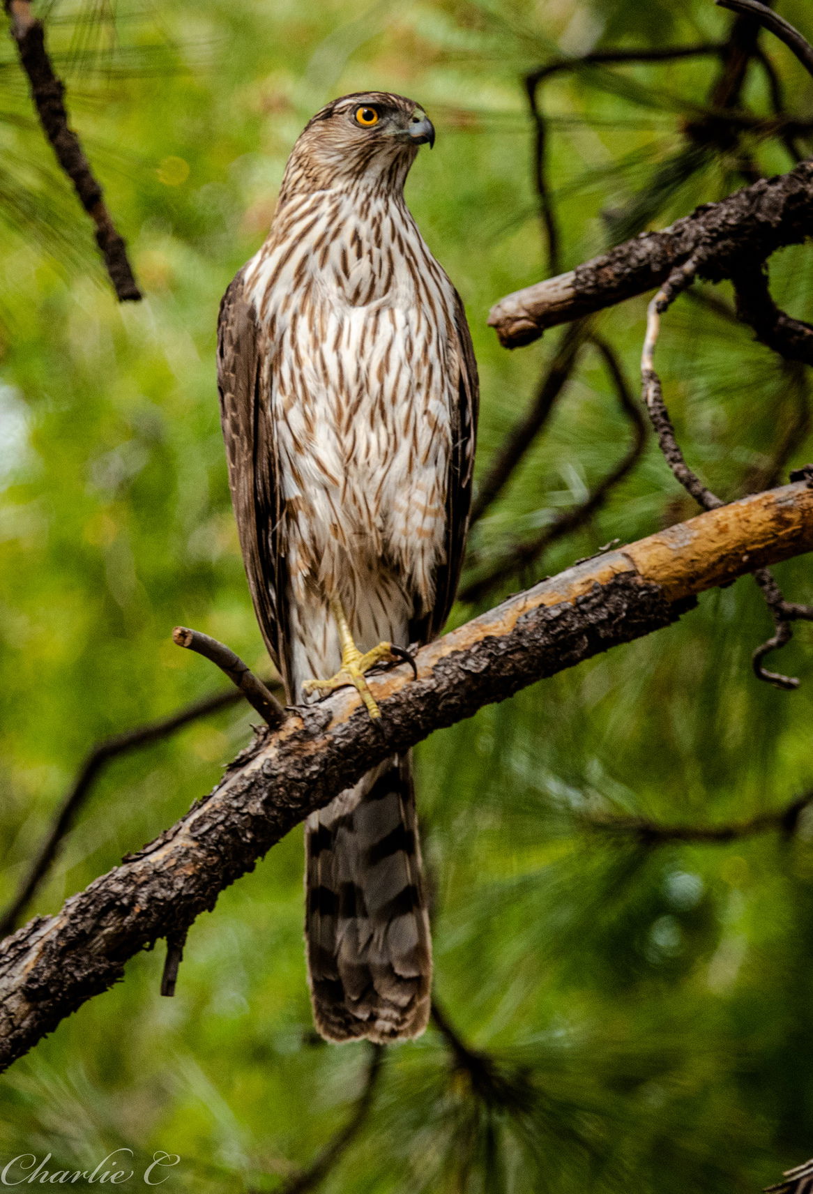 A nice vertical shot. I like how hawk is positioned in the tree with no major branch merging with it. It is a nice bg also. The eye looks very sharp but I am not sure about the detail in the feathers. I might also clone some green over that little white spot on left photo edge.