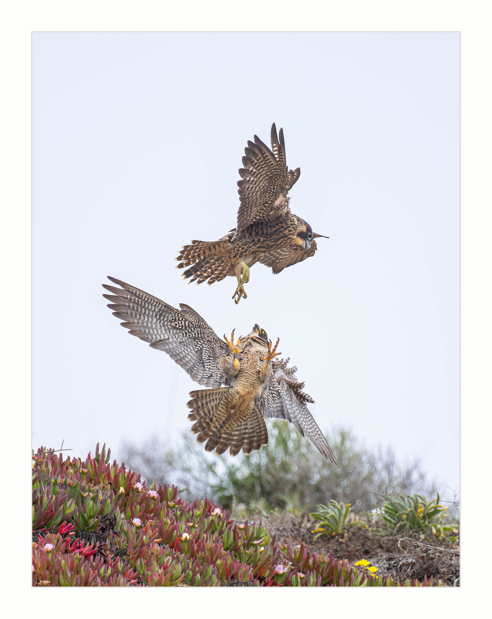 I’m not sure if the parents can hunt when visibility is so poor and as luck would have it, as soon as the fog lifted we started to get all kinds of action at the first nesting site. While there was still a little bit of fog one of the juvis dove down where mom was sitting and scared her into an upside down talon jump which I thought was pretty dang funny.