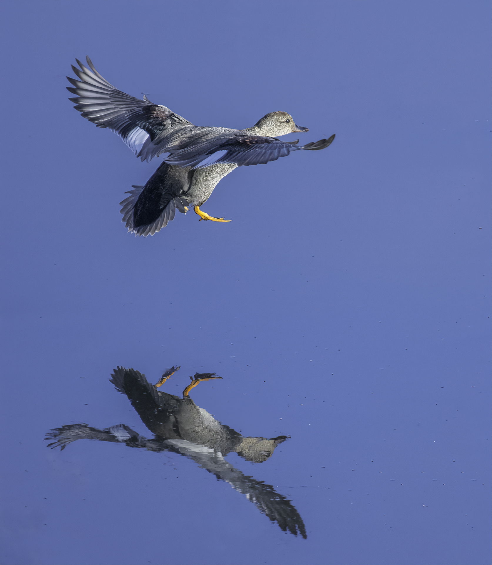 Yes, an interesting image given that there is no discernible water line. What I like is the nice view of the Gadwall’s wings, so for me, this view works well, particularly since the eye is visible. Nice capture.