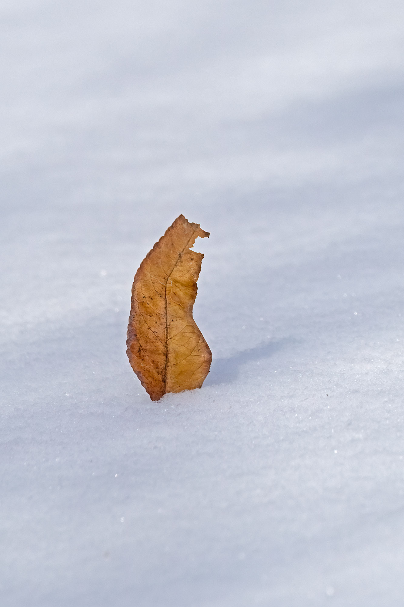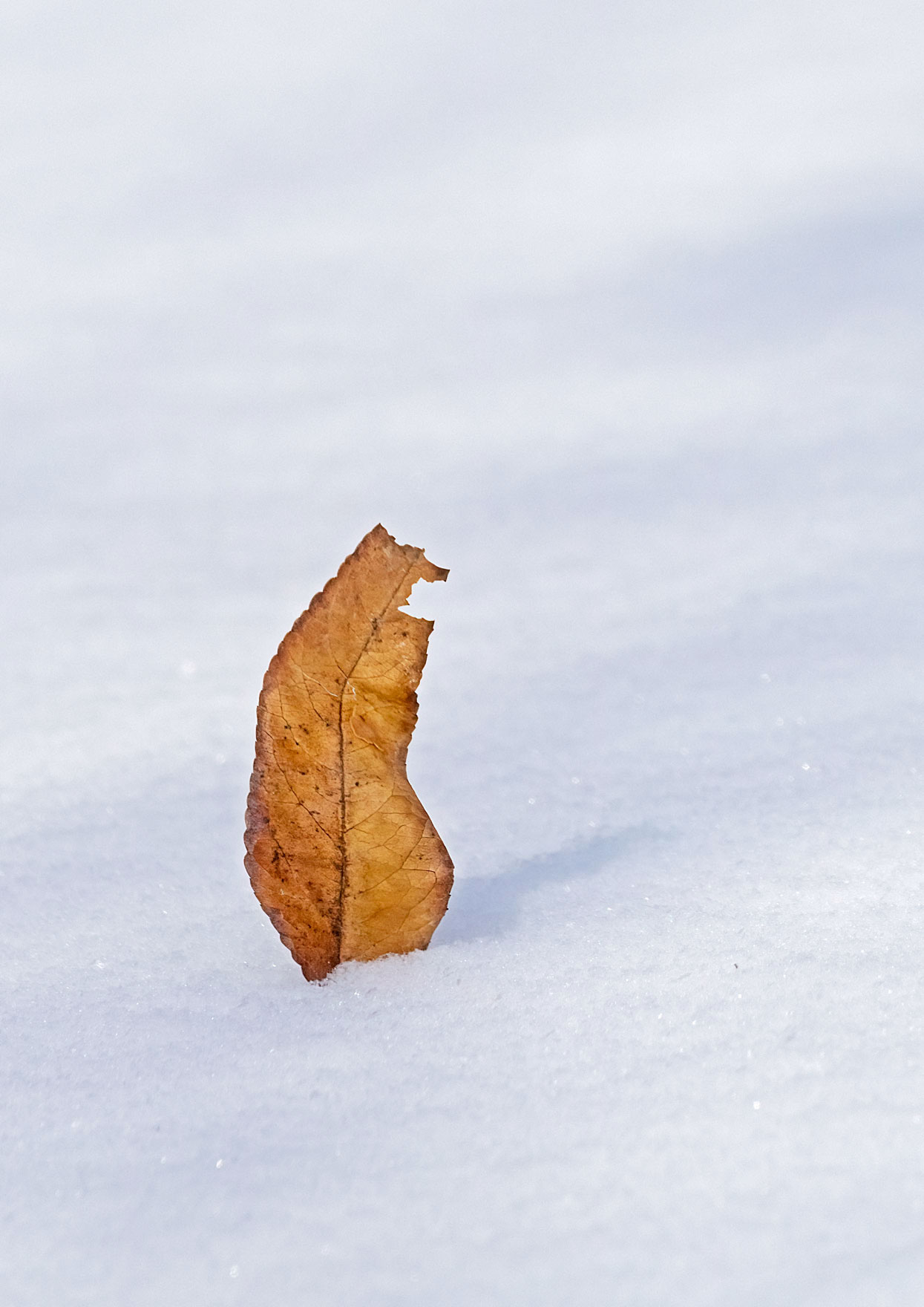 Ugh. Sorry. But it’s so much like what I would stop for. The vertical orientation is perfect and the diagonal shadows are a nice element to bring some life to the snow. Such a ragged little leaf, I’m glad it got some love. The crop and amount of snow look about right to me, but maybe a little off the top wouldn’t hurt.