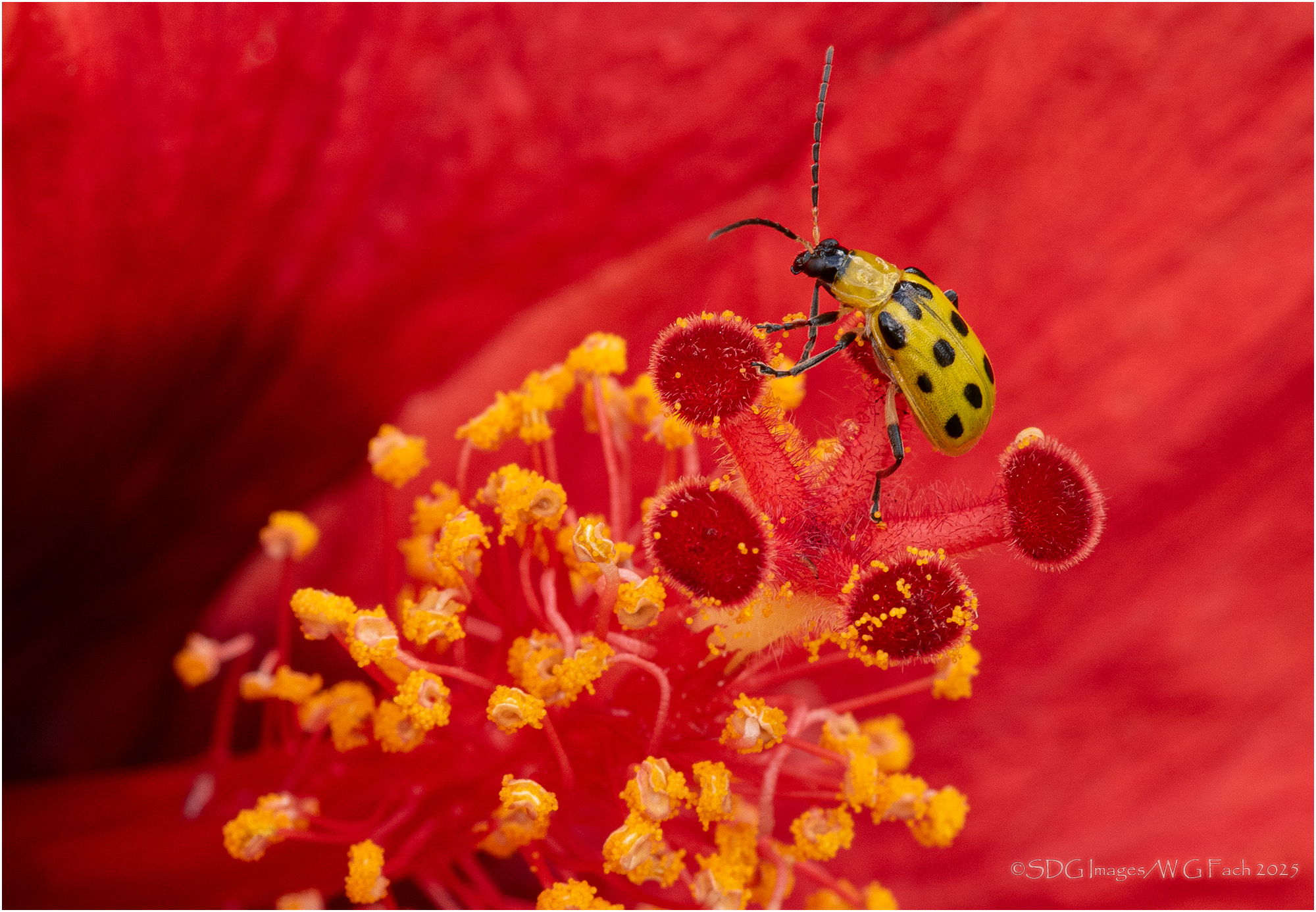 I do believe luck favors the well prepared and that I would rather be lucky than good. Yesterday morning I was out in the garden shooting our late blooming hibiscus. Got some good shots (see Flora) and was pretty satisfied. I had to move some yard flags that Chrissy put up for Thanksgiving but I forgot to put them back. I went back out to replace them early in the afternoon and spied this spotted cucumber beetle munching away on the pollen of the hibiscus. I half shocked Chrissy when I burst in the door to grab the camera. As it turned out it lingered for quite a while and after I got some shots with the 70-200 I went back in and grabbed the high mag rig. With the Macro lens I had to shoot a lot of bursts to try to catch a tiny break in the breeze that would allow some clarity with the slow SS. I could have bumped the ISO but the A77 doesn’t perform as well as the A7rIII at higher ISO so I try to stay at 400 or less. All in all a serendipitous moment made possible by simply forgetting to replace the flag. >=))>