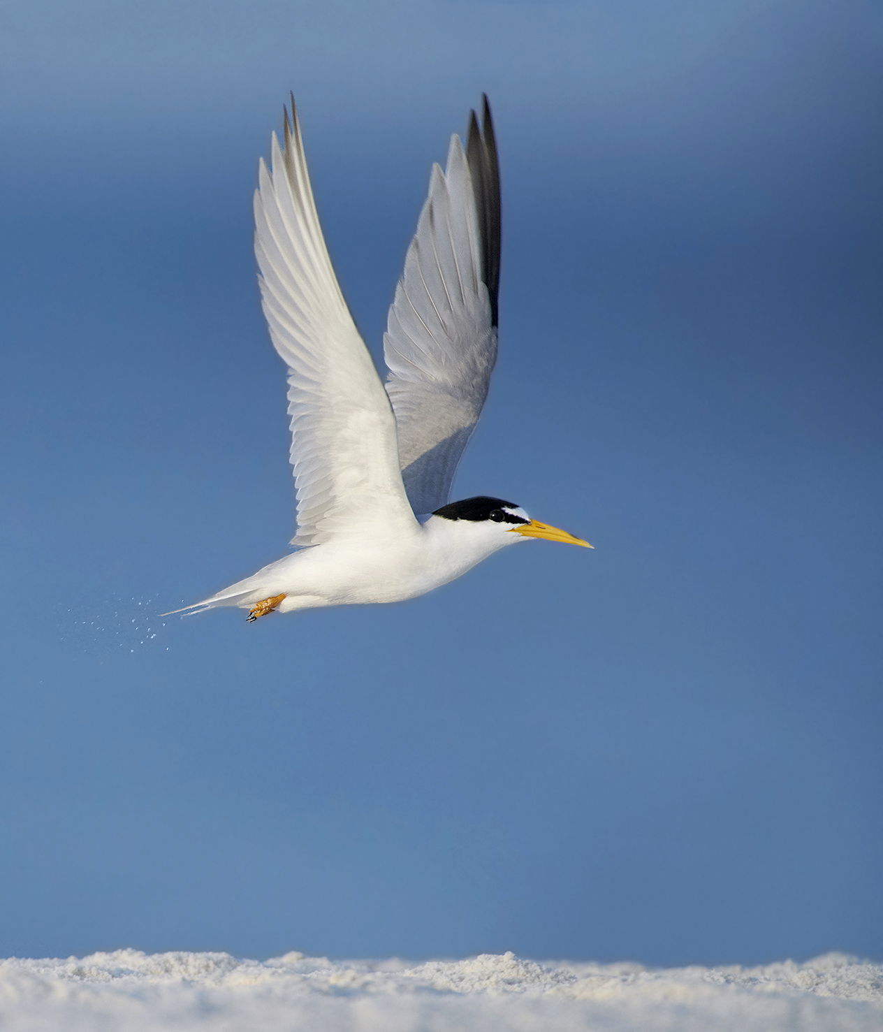The wing upstroke is perfect and the ocean background is perfect, Lyle. I also like the strip of sand there, it just grounds the image and gives context to the flying sands behind the bird.