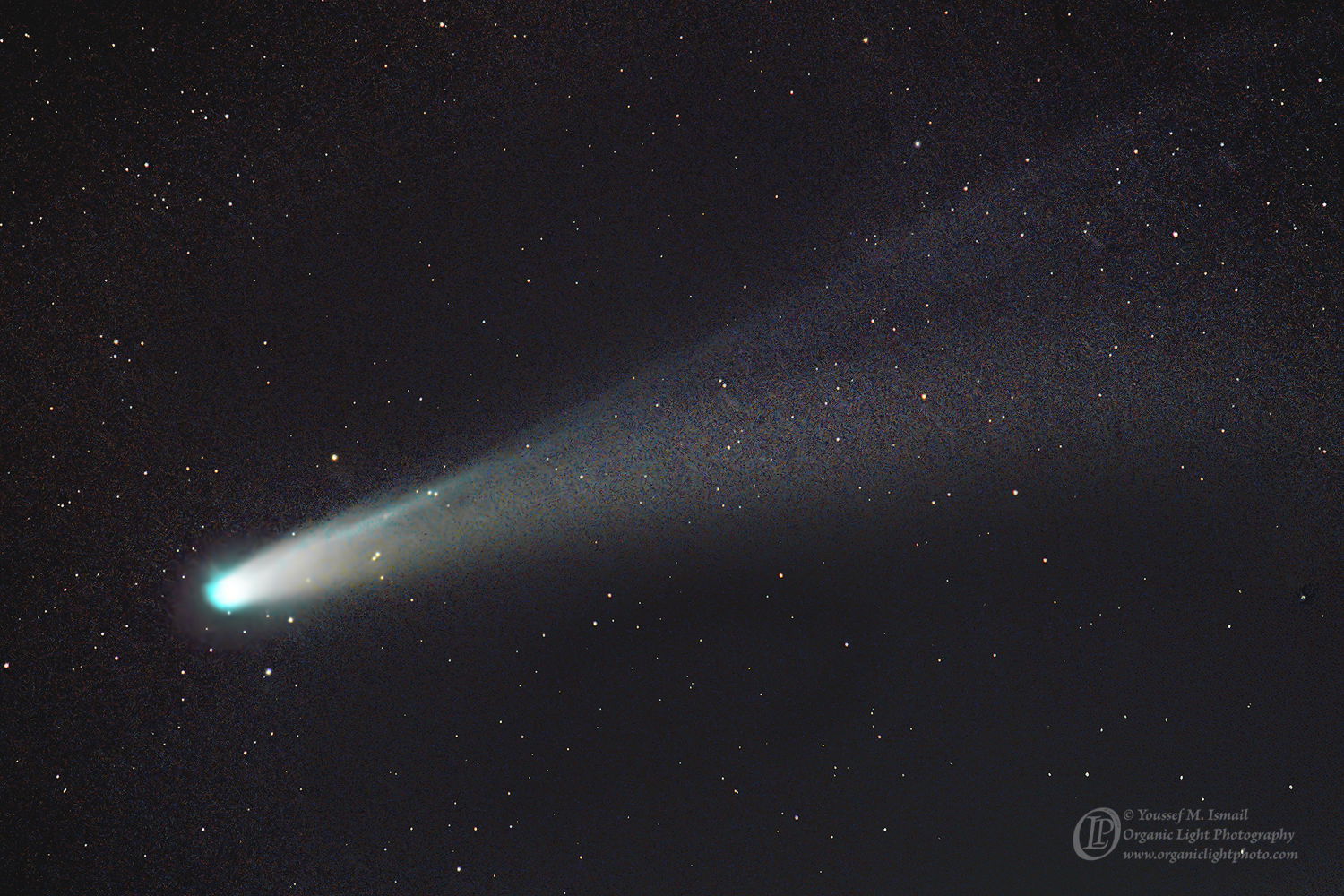 Youssef, Revisiting this image certainly paid off. The detail in the ion and dust tails you managed to pull out in processing, in spite of the obstacles, is amazing. To me the noise does distract just a bit so I took the liberty of downloading the image and running it through Topaz Denoise (Standard +70 noise/+6 sharpness). I think it cleaned up the image nicely without losing stars. I also burned in the mid tones to reduce the halo on the leading edge of the comet. See what you think. You should have better results with the original.