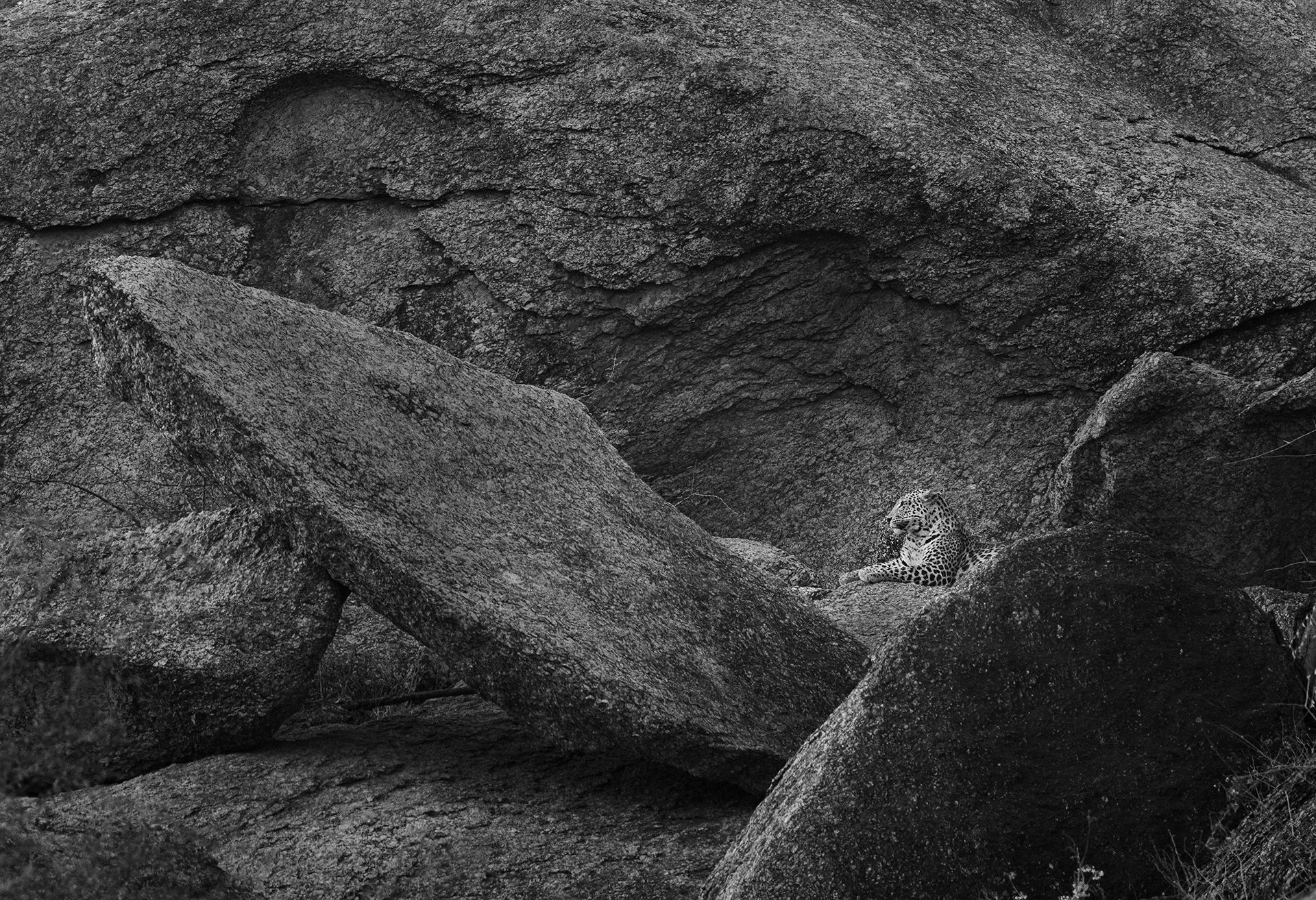 I like the choice for B&W here. For me, composition with the rocks is already interesting without the leopard (often an prerequisite for a successful image WITH an animal, when the habitat is included in the image). I agree with @Max_Waugh that there is no reason to keep the brush in the LRC. But I’d prefer to remove it without cropping, to keep the aspect ratio. Maybe just darken it.
