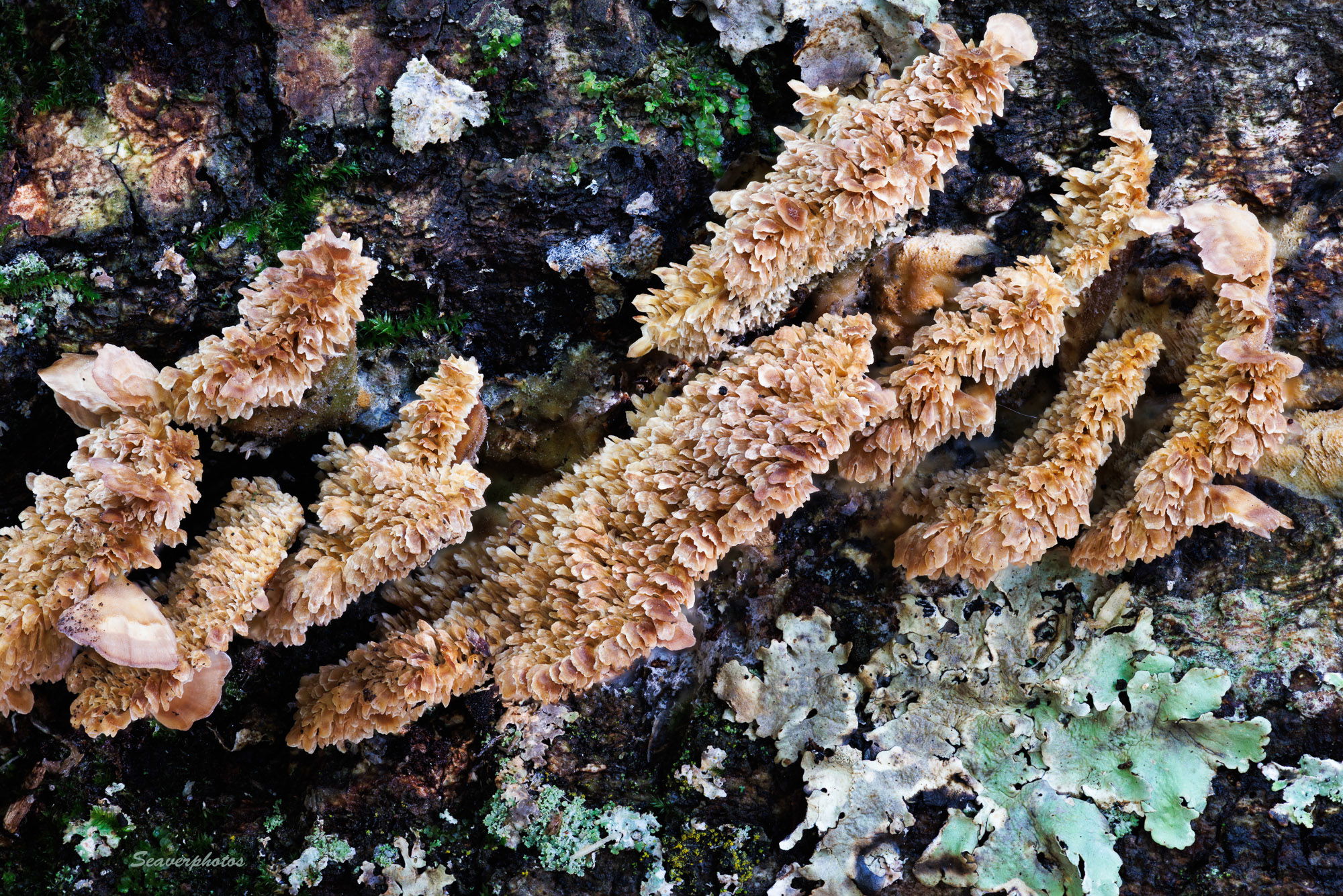 This mix of lichen and fungi is growing on a fallen tree in the woods behind my house. I was attracted to the “crawly things” shapes as well as the variety of colors and species.