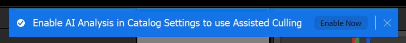 Since I don’t do people to any significant extent, I went into the settings and disabled the AI to get rid of the automatic assisted culling nonsense in LR. However, every time I activate a filter for the images I’ve chosen to process I get this stupid nag bar that usually takes two shots to get rid of. Does anyone know how to get rid of it permanently?